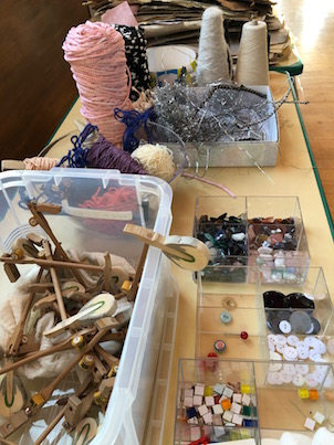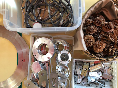 例えば写真の左下は使われなくなったピアノのハンマーです。廃材が、幼児の創造性を刺激する素材としてリユース(再利用)できるのです。素材を見て、触って、組み合わせるうちに、子どもたちのイマジネーションがどんどん広がっていきます。