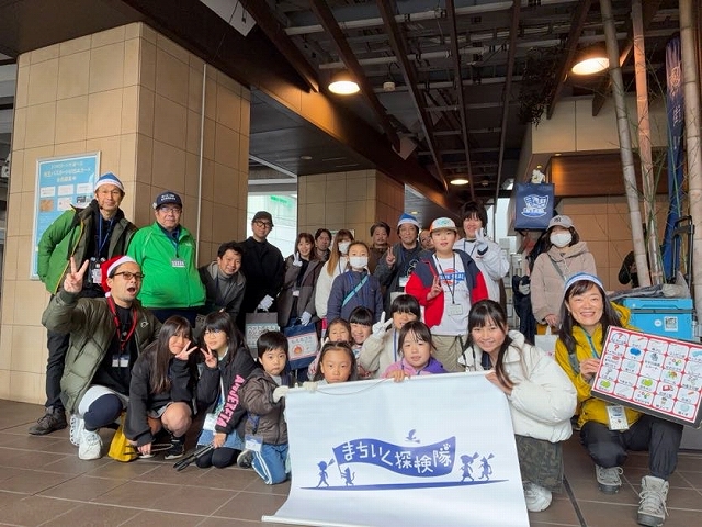 【ゴール】約45分間のまち歩き&ゴミ拾い活動を終えて、再び高架下のロッテリア前へ。ゴミの回収を終えて皆さんから感想を聞きました。「楽しかった」「いろんなゴミがあった」「まちの歴史を知れてよかった」など、思い思いの感想をシェアしてもらいました。最後にクリスマスシーズンということで、ちょっと大きめのお菓子の袋詰めを全員にプレゼントして終了しました。