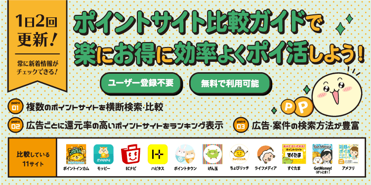 ポイントを効率良く貯めるために、ポイントサイトを比較しながら「どのポイントサイトが一番ポイントが高いか?」を比較することができるWEBサイトとなっています。