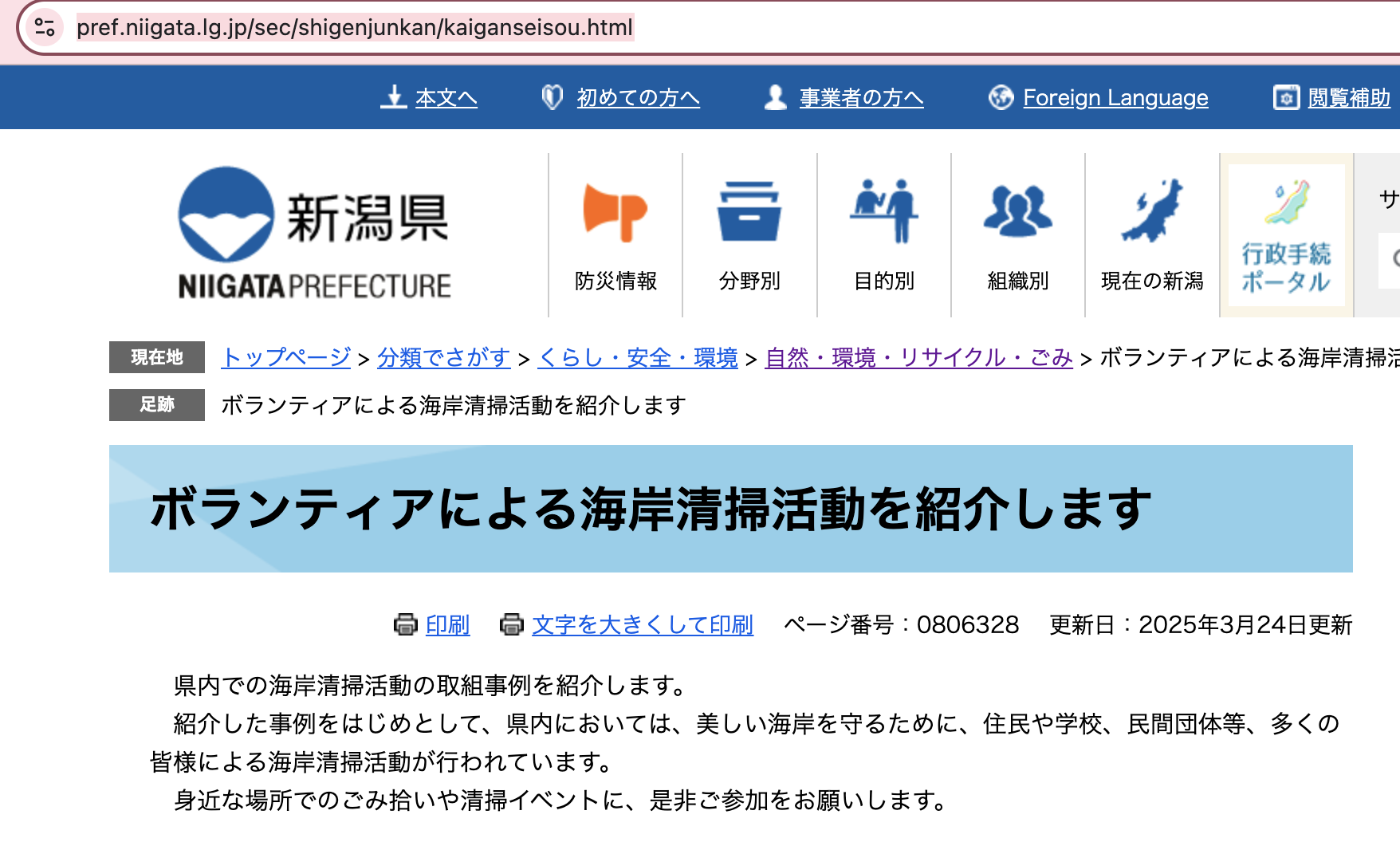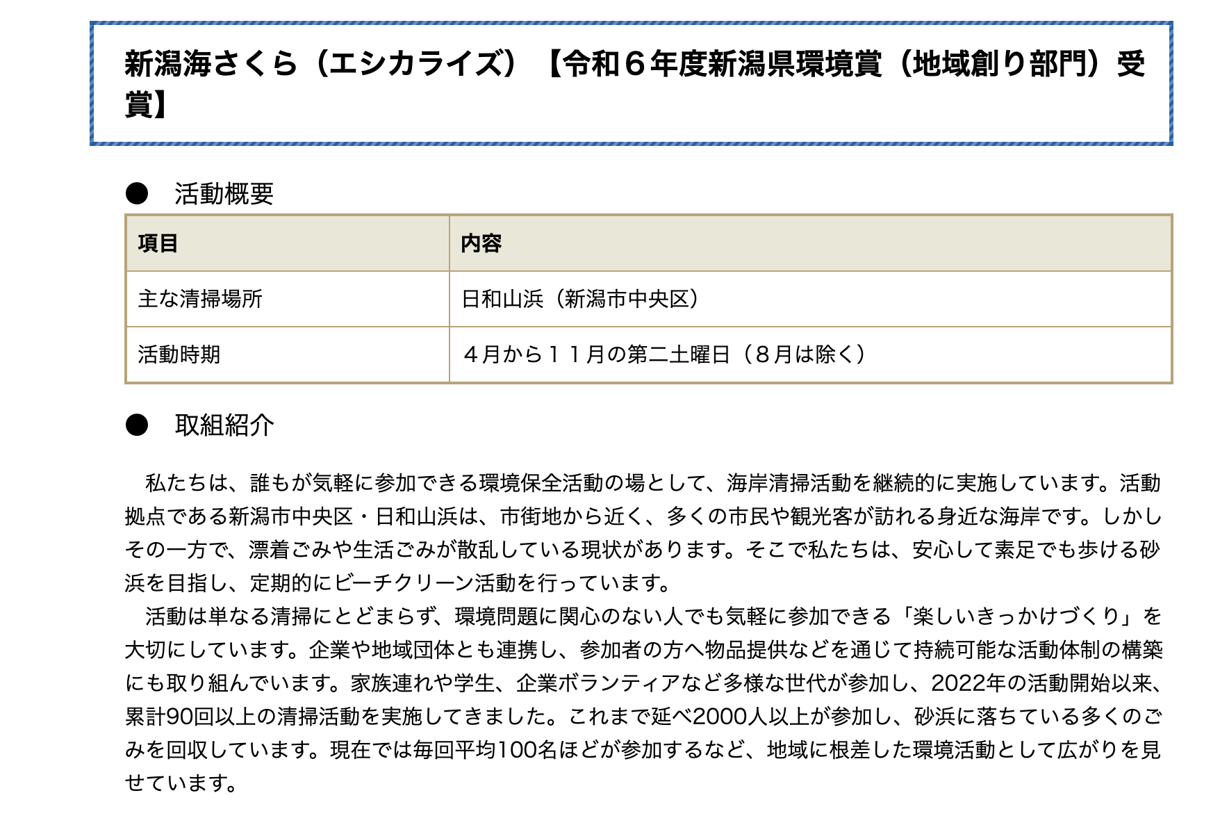 新潟県の公式サイト内にて 新潟海さくらの活動について取り上げて頂きました! ぜひご覧頂けますと幸いです。 https://www.pref.niigata.lg.jp/sec/shigenjunkan/kaiganseisou.html