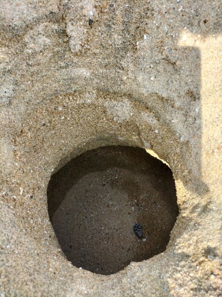 砂浜を歩いていたら、直径35センチほど、大人の膝がすっぽり入るくらいの大きな穴を発見!