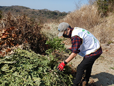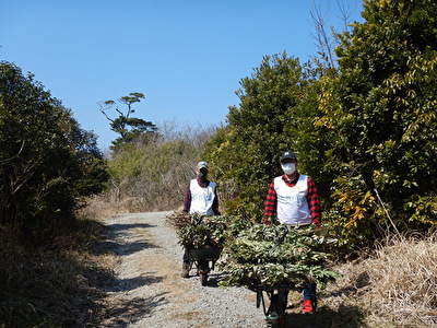 この日は、廃棄予定だった草木を使って、山道づくりの材料となる粗朶づくりをしました。
