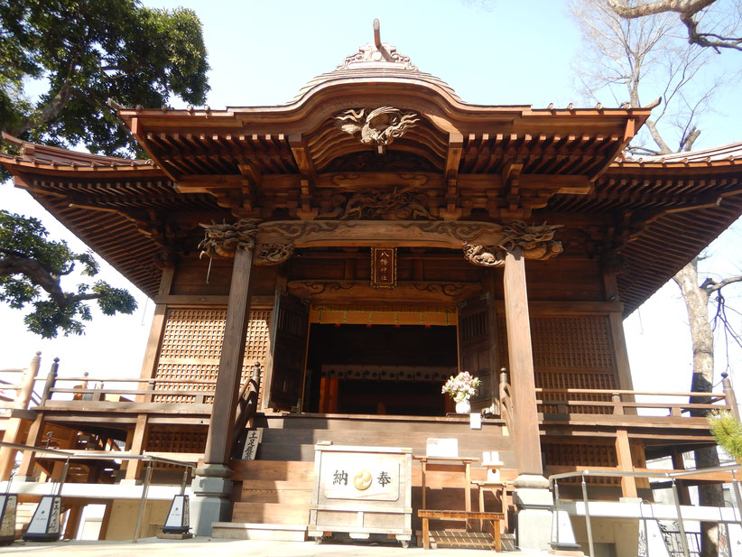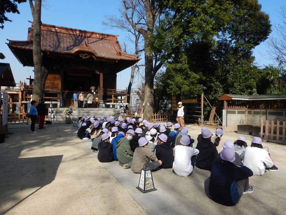 御社殿は、江戸時代(安政二年一八五五)に落成した総欅造り。都内に現存する珍しい木造の建物です。移築時には、ニホンミツバチの巣が発見され、地域の方々と神主様が試行錯誤され、新たな棲み家が提供されていました。そうした社殿周囲に点在するアカガシやタブノキ・スダジイや天然記念物のケンポナシの大木等々、限られた時間の中で可能な限り、生で触って、五感で感じて、地域らしさ、日本らしさを学んでいただきました。