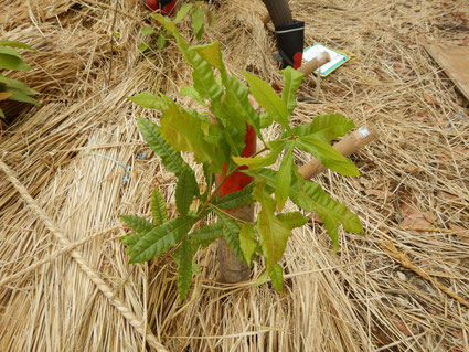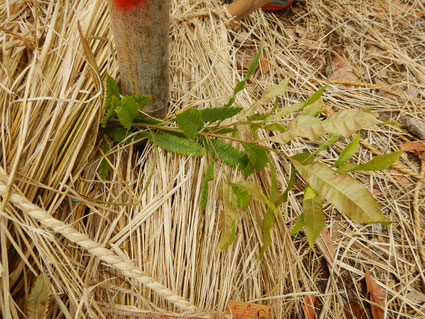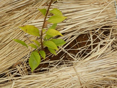 写真:ワラで倒れているヤマモモの苗木