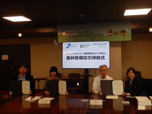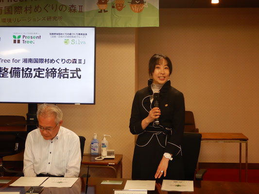 神奈川県庁で開催されました協定式では、認定NPO法人環境リレーションズ研究所の鈴木 敦子理事長が『「Present Tree for めぐりの森Ⅱ」を通じて、湘南国際村めぐりの森での植樹事業の認知度や来場者数を向上させる助けになれば、森も活動も活性化され関係者全員がハッピーになれる筈』と激励くださいました。息長く全国区へ展開されている