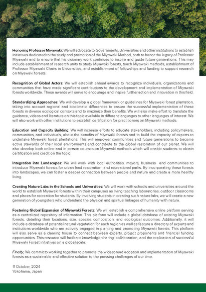 最後に、私たちは、現代の喫緊の課題に対する持続可能で効果的な解決策として、宮脇フォレストを広く採用し、実施することを促進するために、共に努力することを約束します。