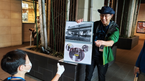 昔の笹塚駅の写真を紹介。改札の切符切りの真似をする二人(笑)