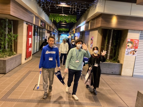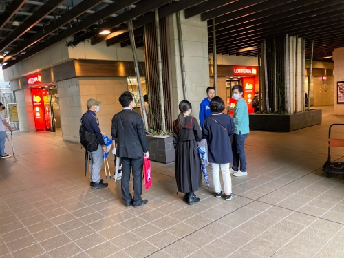 街いく探検隊 京王クラウン街笹塚・フレンテ笹塚チームの活動は京王線高架下での活動を行いました。集合場所を、いつものけやき広場から高架下のロッテリア前スペースへ変更です。