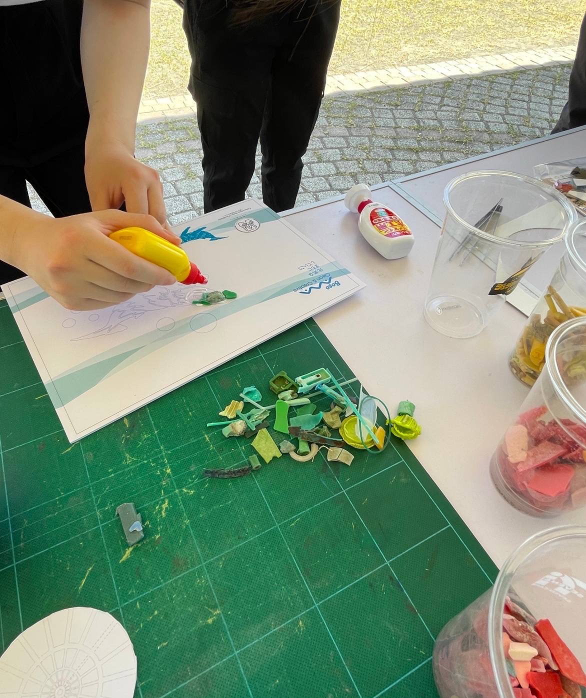台紙に色々なプラゴミを貼り付けて、作品を作っていきます!