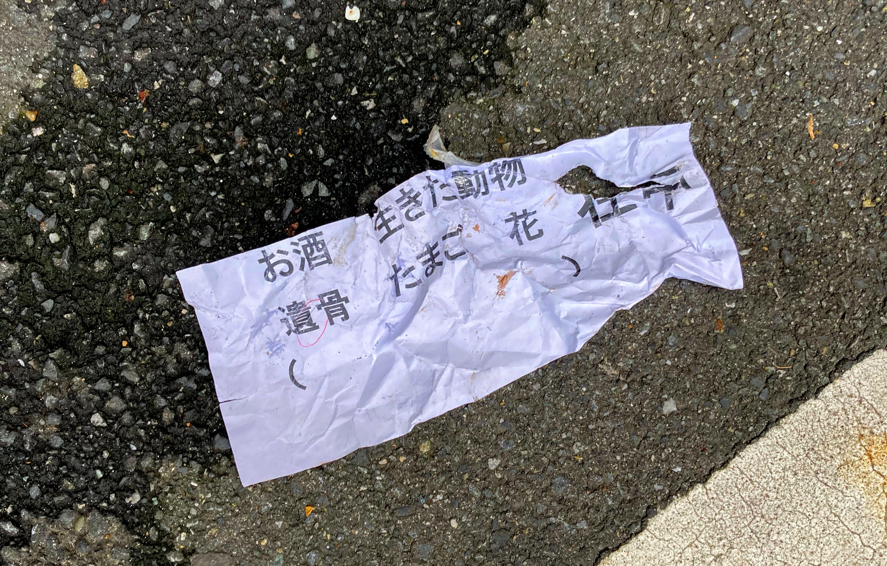そして、更に予想外のことが!お寺やお墓の多い麻布ですが、こんなナゾの紙を拾いました。「お酒」「生きた動物」「遺骨」「たまご」「花」、この5つに何の関連性があるのかまったくナゾです。生きた動物、、、分かりませんが、とりあえずこの紙も回収して街は綺麗になりました。
