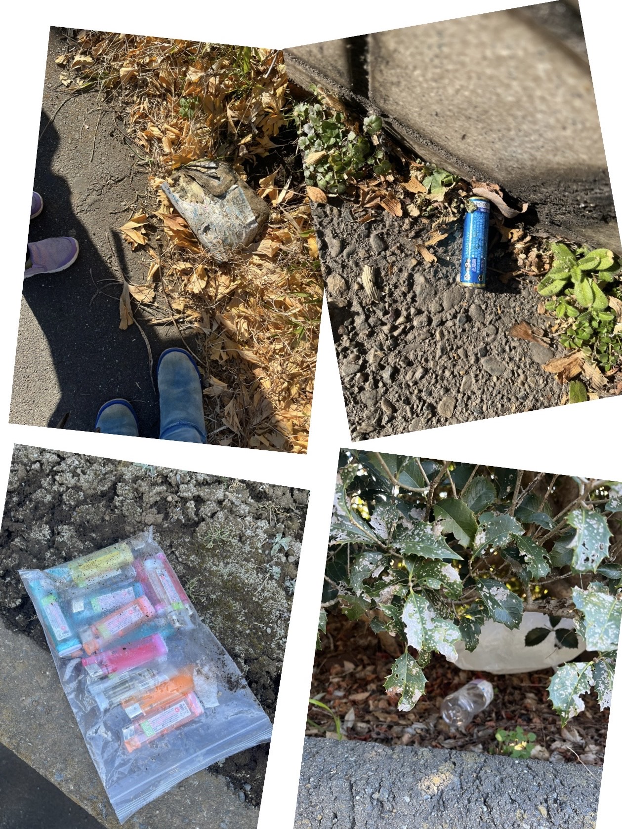 燃やすゴミ、瓶、缶、PB、割れた陶器の器、電池、大量のライター、三角コーンの重し、吸い殻(154本!)などを拾いました。