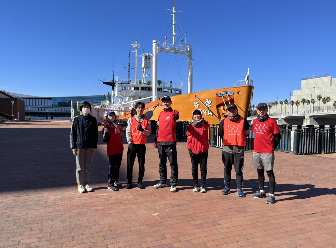 準備運動ストレッチは初代南極観測船宗谷の前で行ってからキックオフ!です。