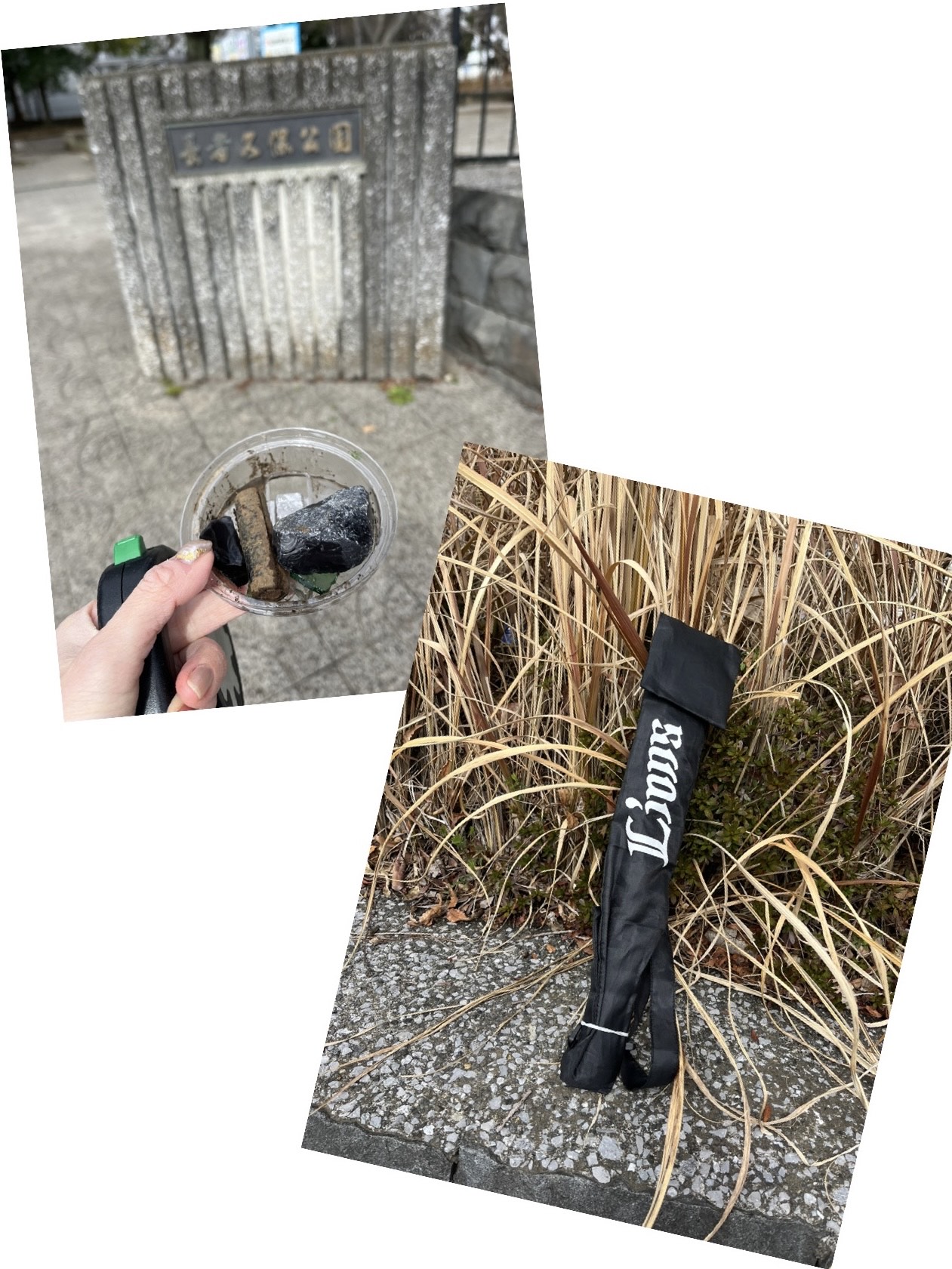 燃やすゴミ、瓶、缶、錆びたワイヤレスイヤフォン、充電器、割れたガラス破片、錆びた電池やライオンズフラッグなどを拾いました。