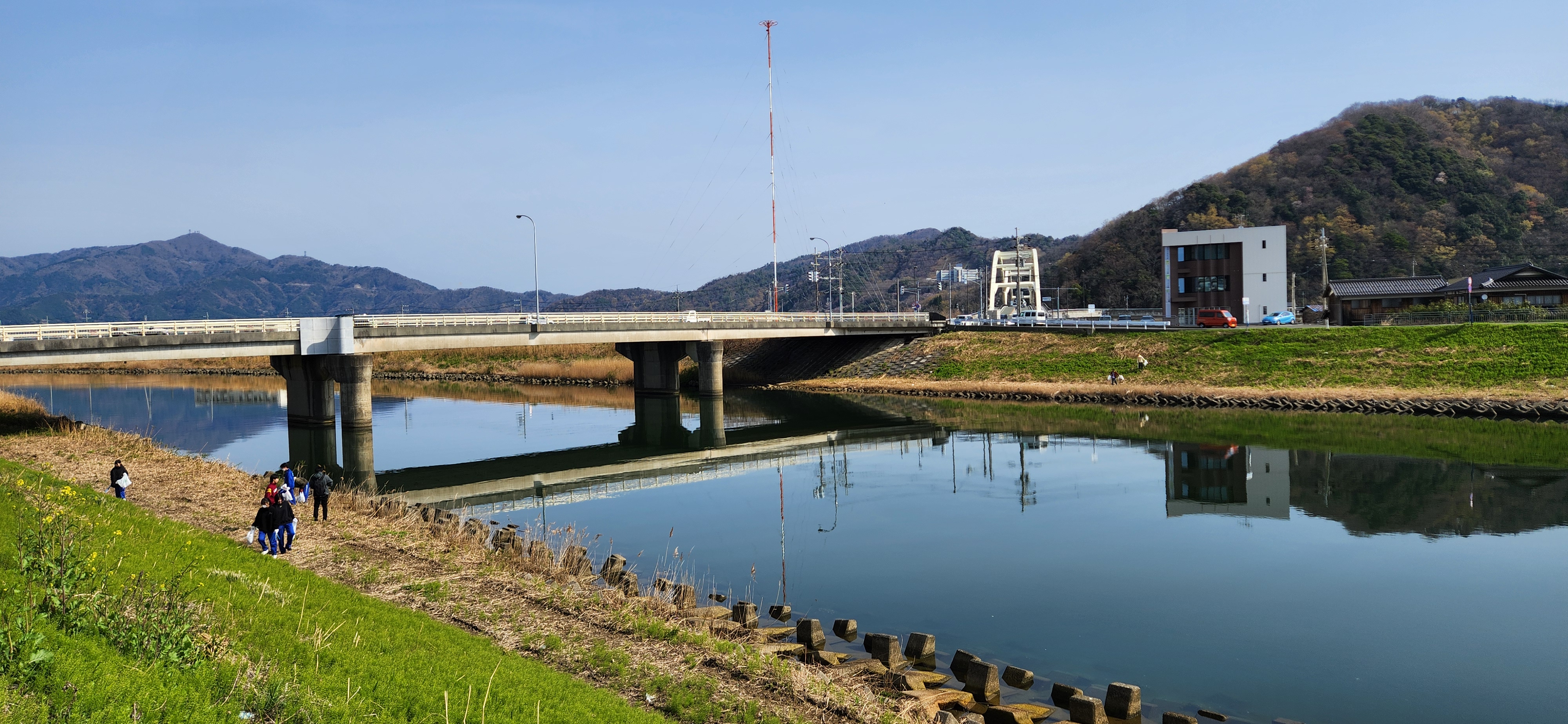 学校のご厚意で現役生が6人も!大変傾斜がきつく・・清掃に入りにくい場所で(主催者が一番不安定?)ヒヤヒヤしながらでしたが、ゆっくり足元確実にしながら進みました。ポイ捨て吸殻の山、何故か洗剤の袋、小型液晶テレビ迄・・水位が高い時の名残か埋もれて取りにくいものから、明らかに最近のポイ捨て又は飛来迄・・あっという間に軽トラ軽く1杯!まだまだゴミは残っていますが、何と用意していた袋が足りなくなるほどで時間切れ、、参加者からは「学校から近い場所にこんなにゴミがあるなんて」等驚きの声が・・足場も悪く、道路沿いで休む場も無く、まいど「”お散歩”かよ!」って企画でしたが、ご参加の方ありがとうございました!きっと高校グラインド桜の美しさもちょっと誇らしげに見えたのでは!