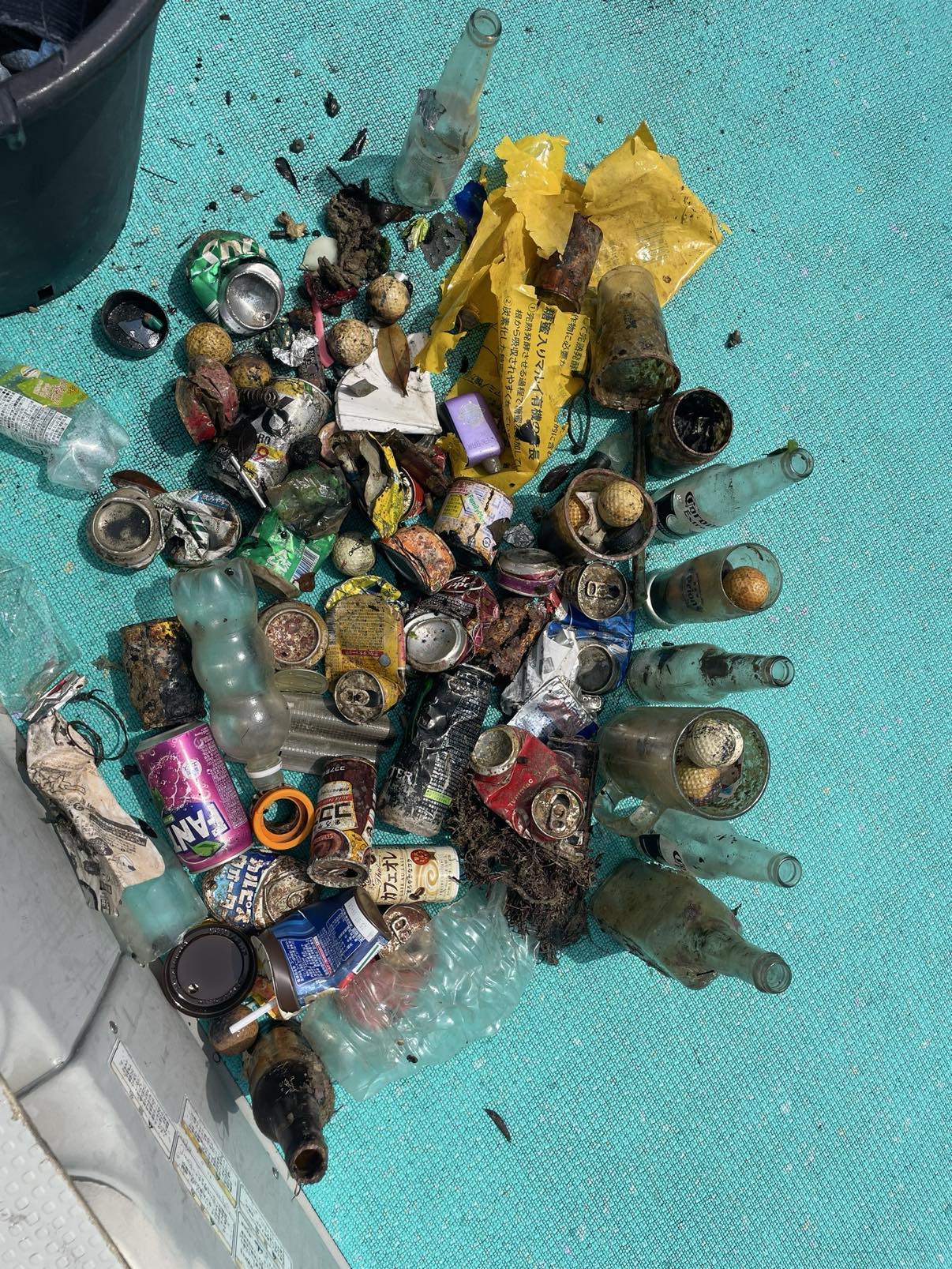 海中で拾ったゴミは空き缶、空き瓶が多く、なぜかゴルフボールも多かったです…。