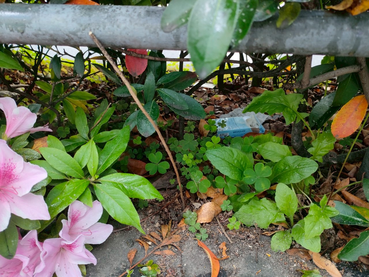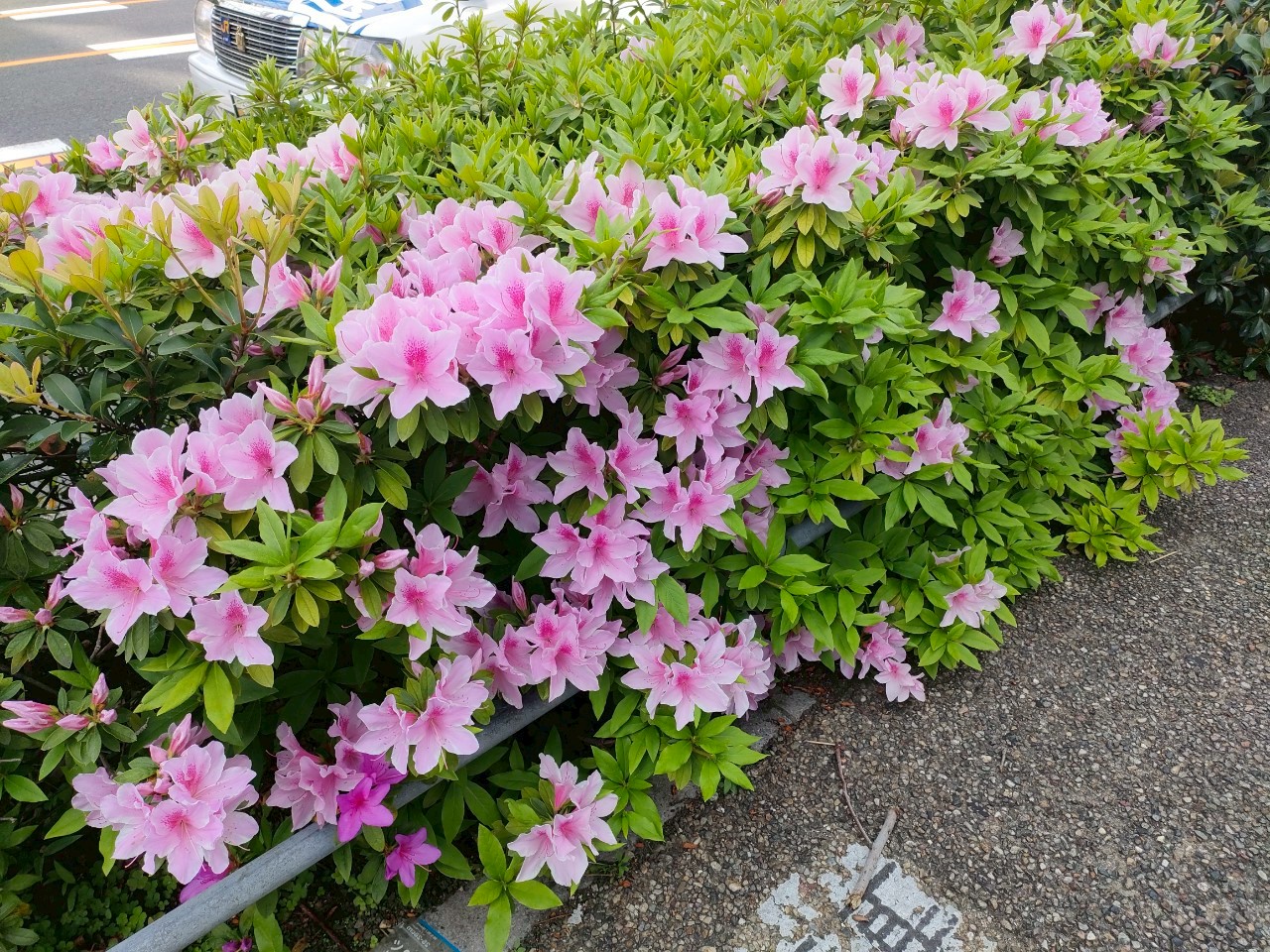 新緑がまぶしく、ツツジも咲き始めていましたが、花のすき間にはゴミが…。