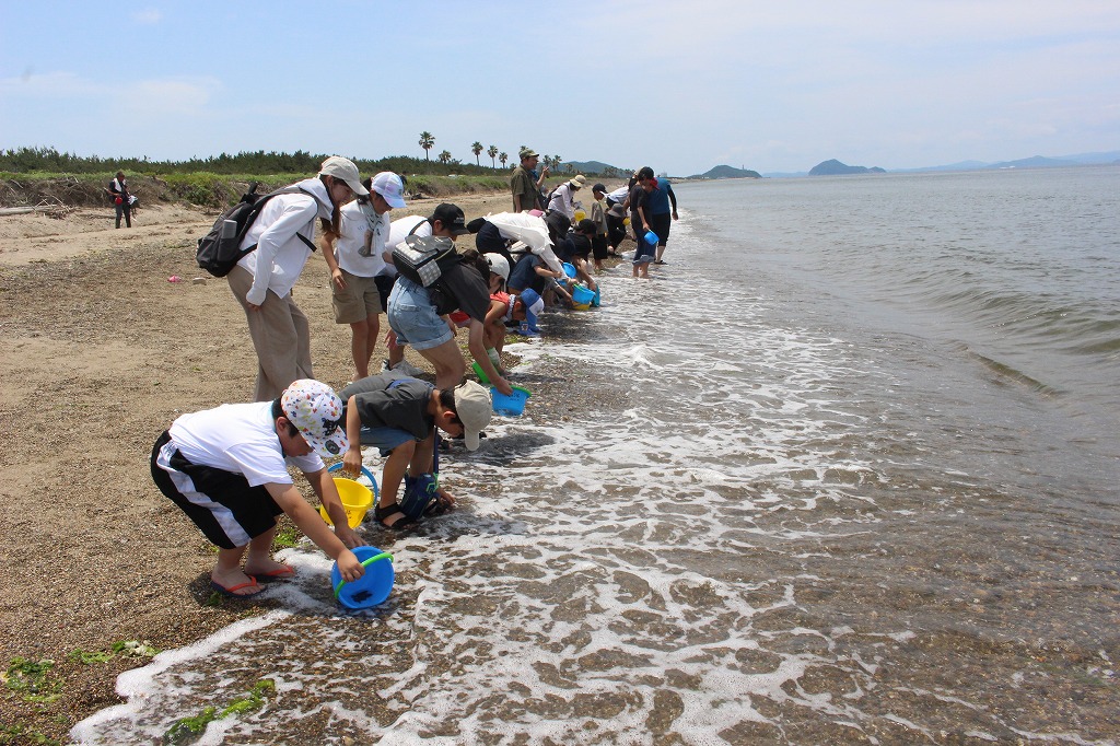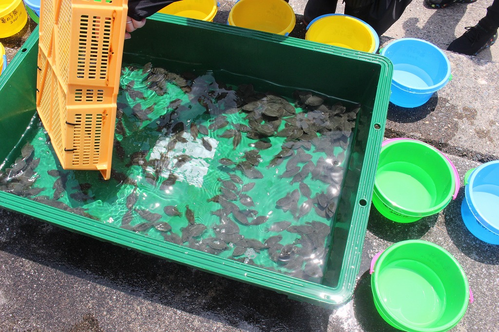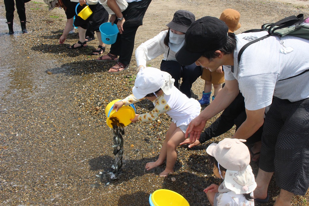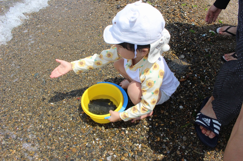 活動終了後は、マリンテックさんのご好意でこつぃも「ヒラメの稚魚の放流会」を実施。波に濡れながら子どもたちはヒラメの稚魚を海に流した。