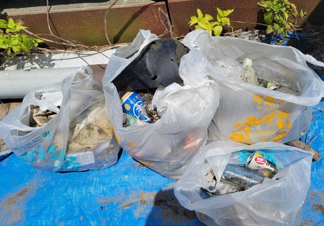 タバコの吸い殻、梱包ビニール類、ビン、缶、ペットボトル、プラスチックの破片など。