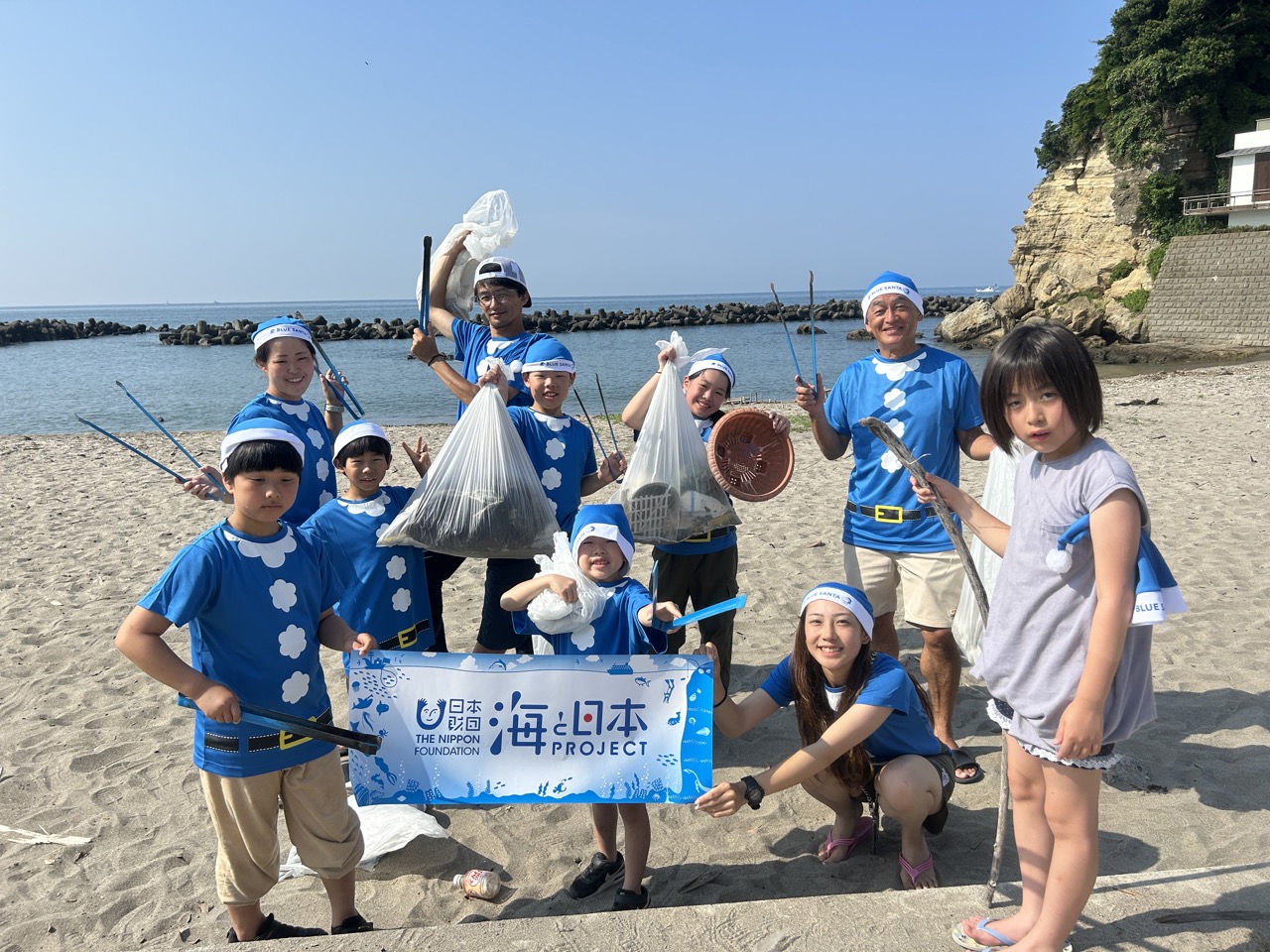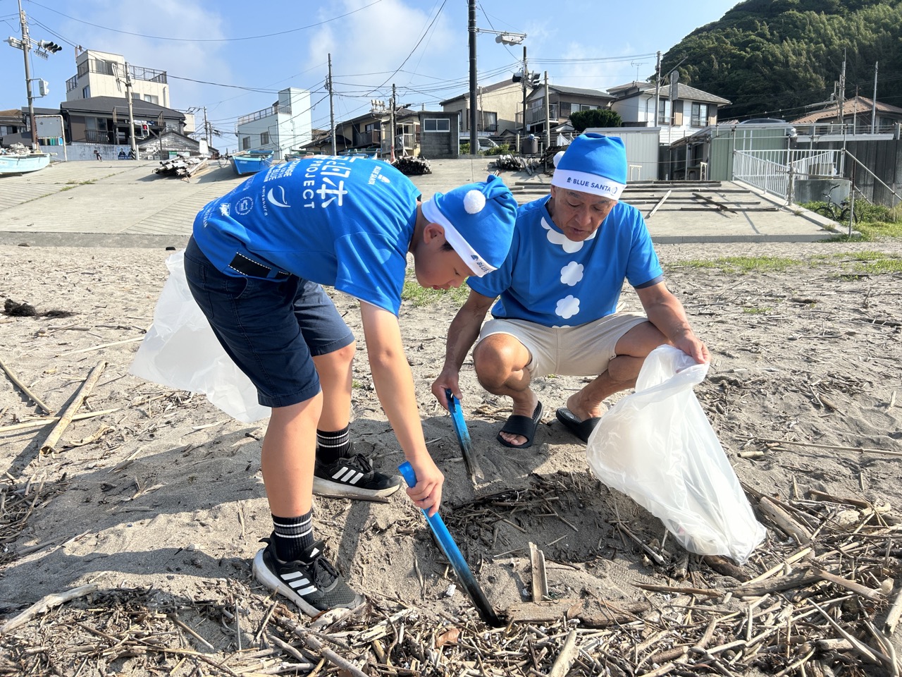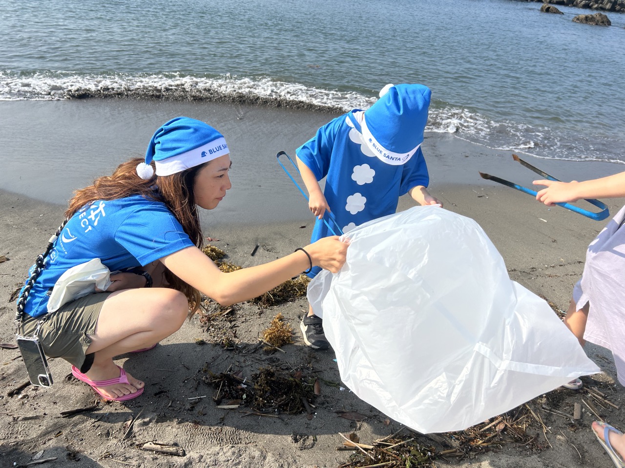 みんなでブルーサンタの衣装に着替えて、ブルーシップのトングと袋を手にゴミ拾いスタート。