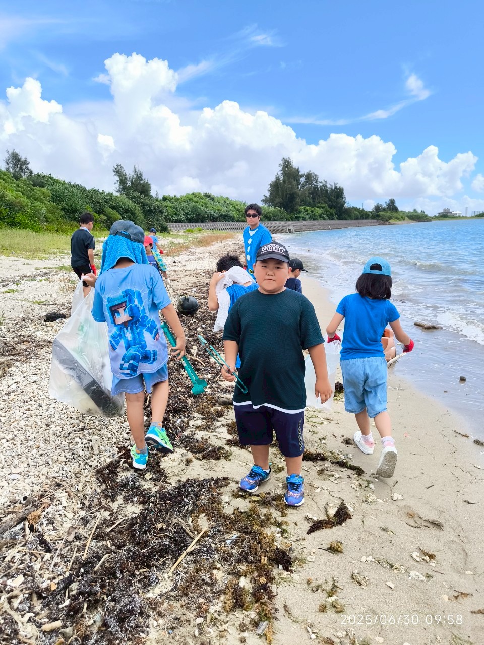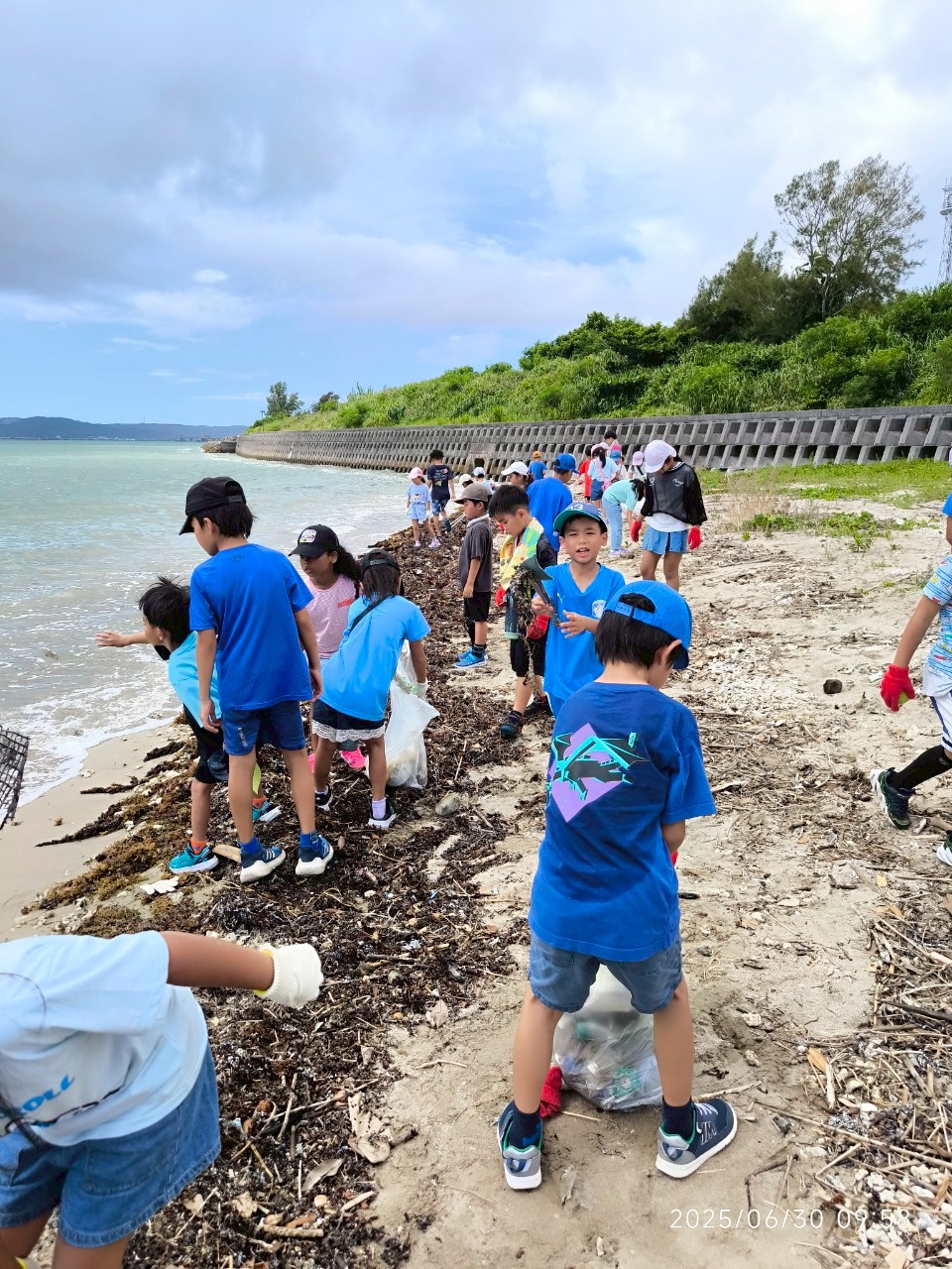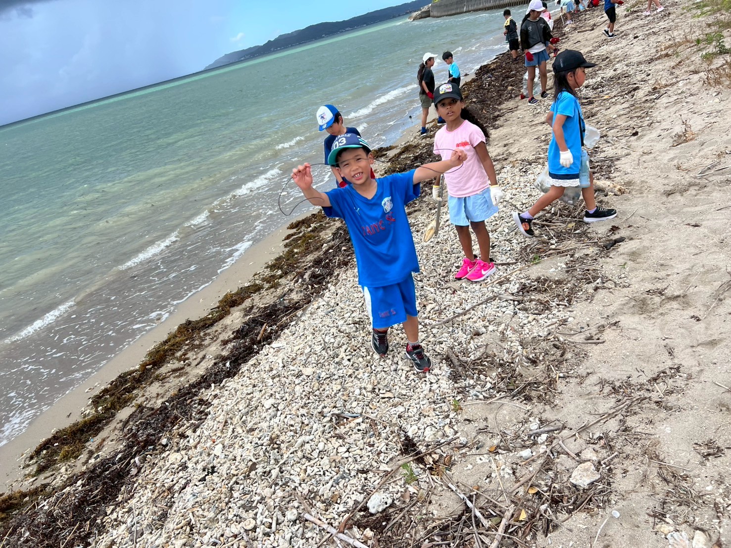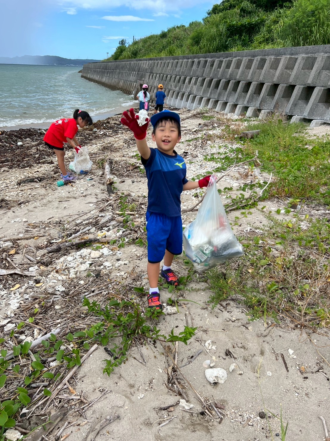 集合場所の津覇小学校でごみ拾いの説明をし、軍手とゴミ袋片手に海までの道に落ちているゴミも拾って歩いて、海についたら、大きな縄やブイのゴミから、細かいプラスチックのゴミ迄たくさん拾う事が出来ました。暑い中で熱中症を気にしながらの活動だったので、時間は30分と短かったですが、大人8名子ども54名で20袋と、粗大ごみのブイ等13個などたくさん拾う事が出来ました。子どもたちから「もっと拾いたい」という声がありましたが、雷注意報が出ていて雨も降ってきたので終了にしました。