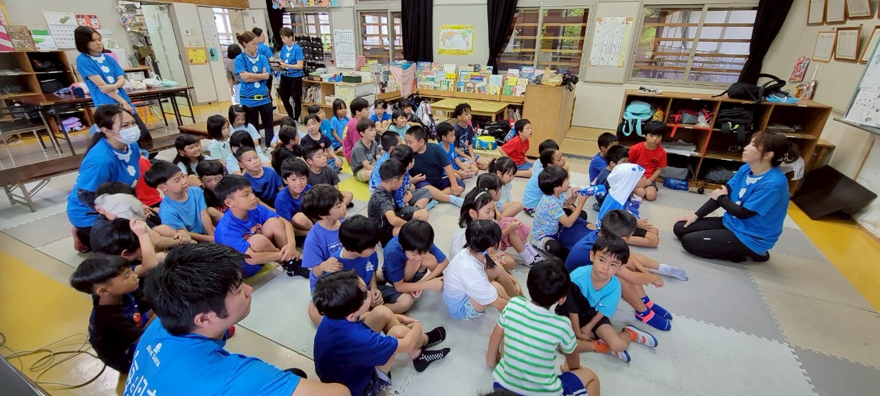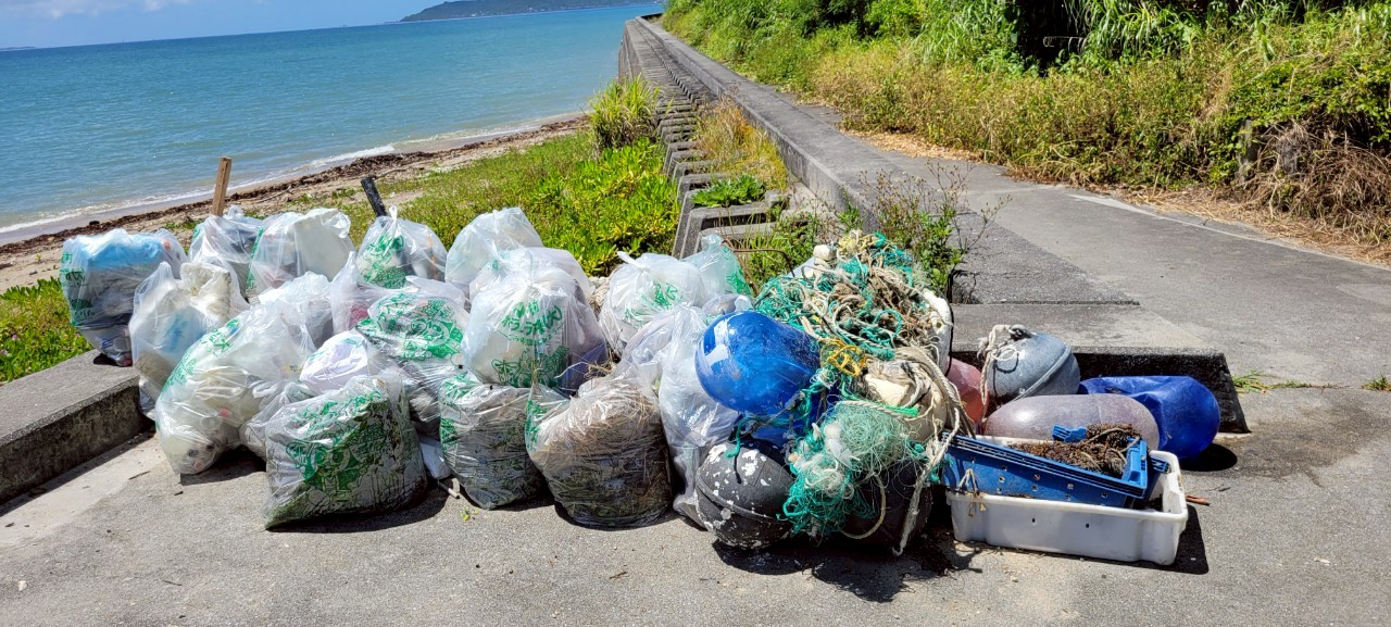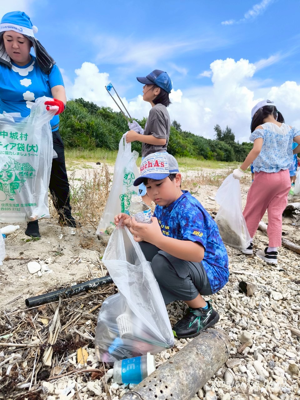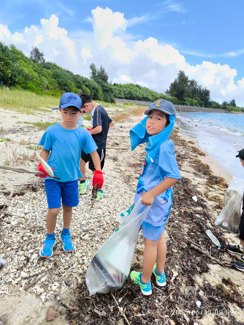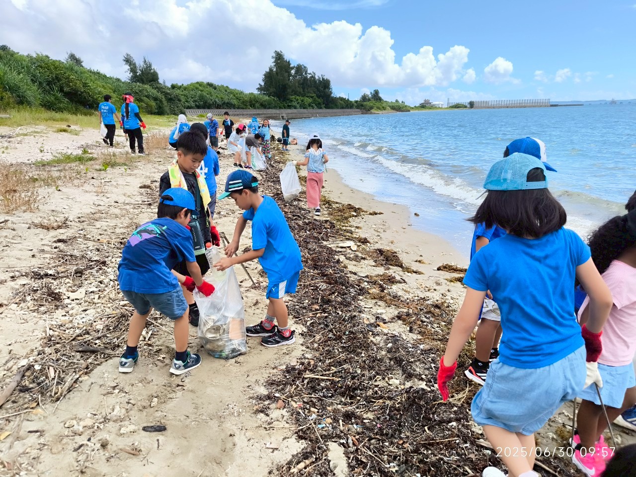 集合場所の津覇小学校でごみ拾いの説明をし、軍手とゴミ袋片手に海までの道に落ちているゴミも拾って歩いて、海についたら、大きな縄やブイのゴミから、細かいプラスチックのゴミ迄たくさん拾う事が出来ました。暑い中で熱中症を気にしながらの活動だったので、時間は30分と短かったですが、大人8名子ども54名で20袋と、粗大ごみのブイ等13個などたくさん拾う事が出来ました。子どもたちから「もっと拾いたい」という声がありましたが、雷注意報が出ていて雨も降ってきたので終了にしました。