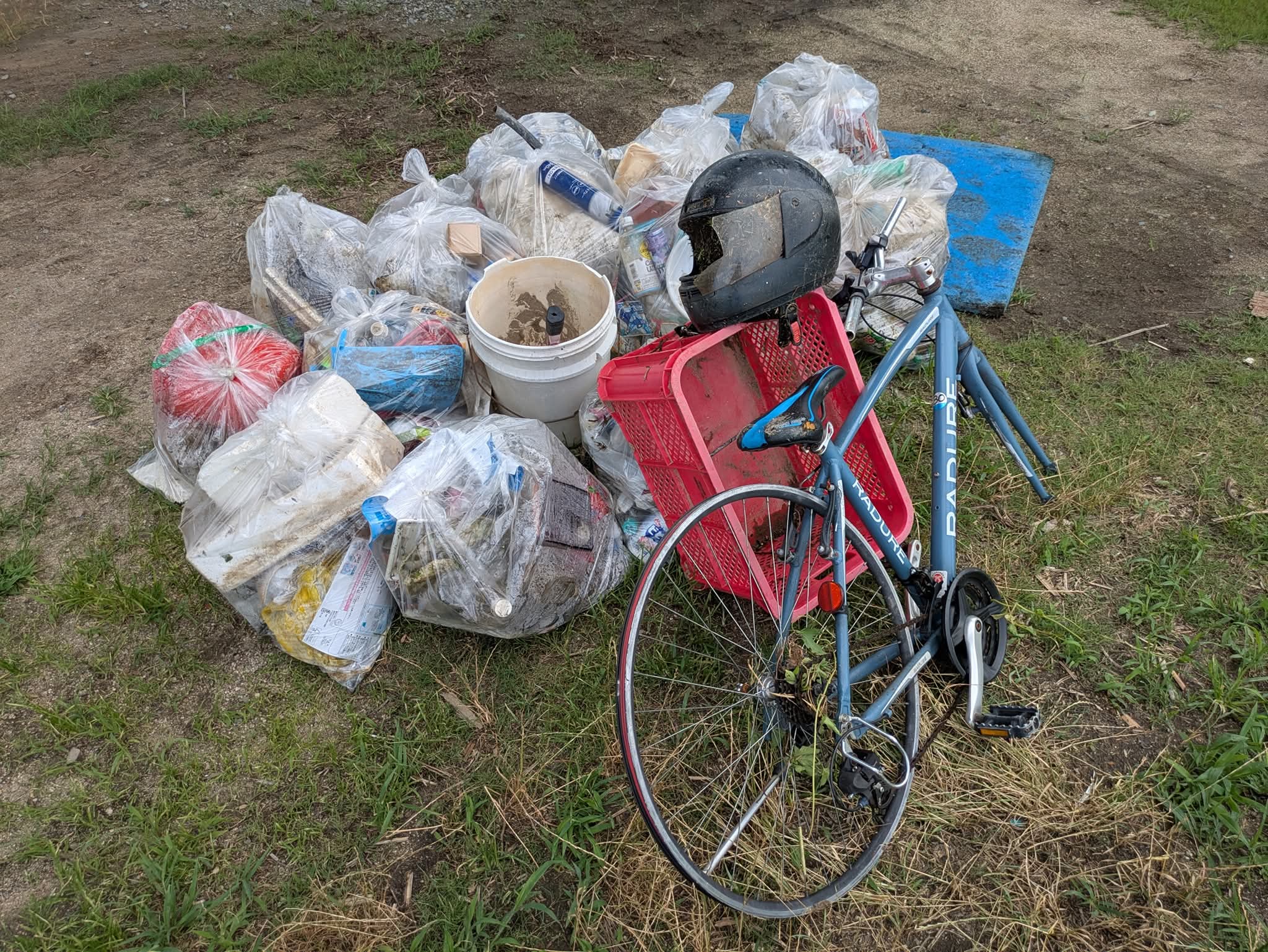 本日6名で片付けたごみは、45リットル16袋、自転車、フルフェイスヘルメット、潜水用ウェイトベルト、その他なんやらかんやら。