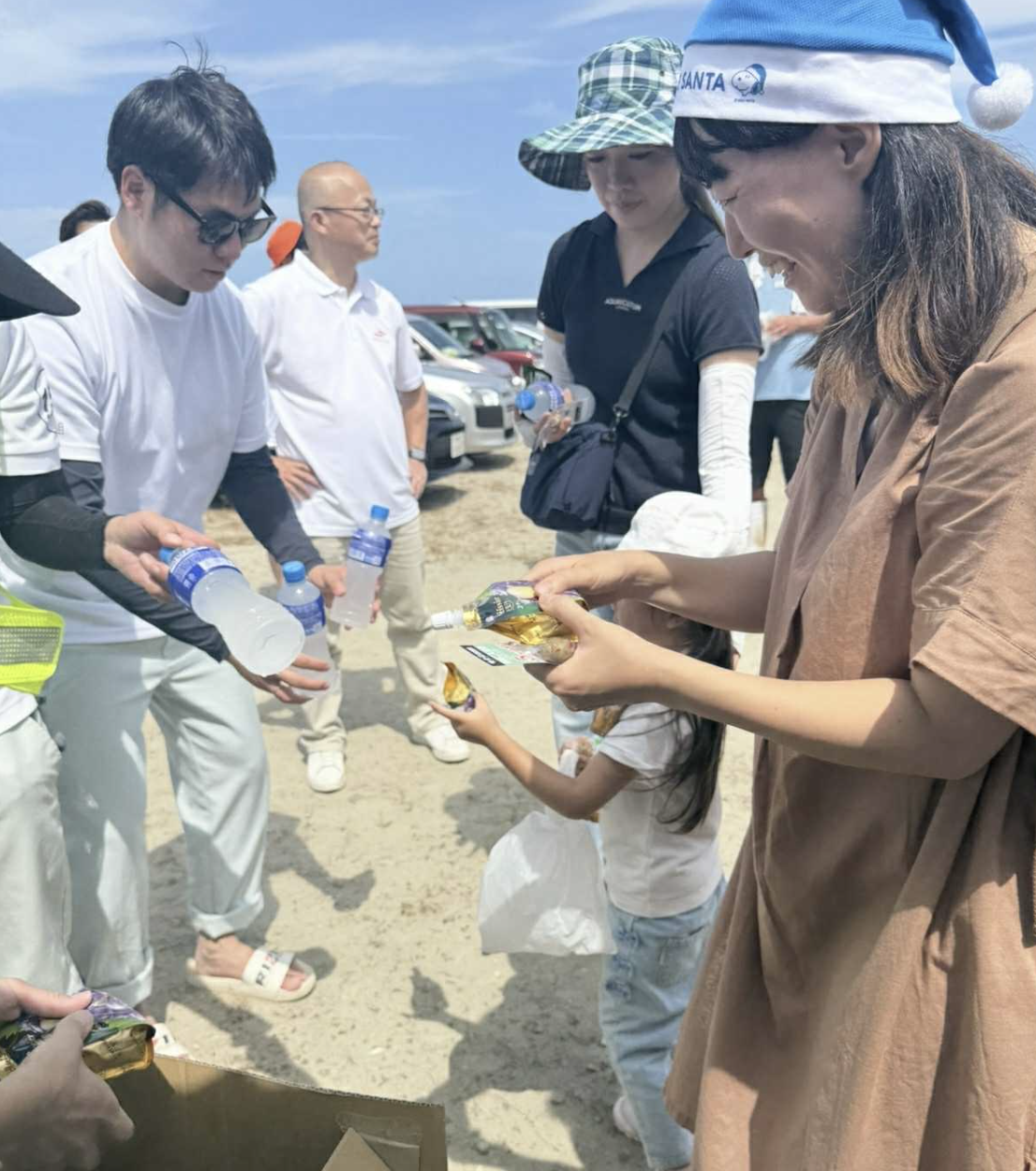 青いサンタクロース姿で海岸を清掃し、楽しみながら環境保全の大切さを伝えることを目的としています。