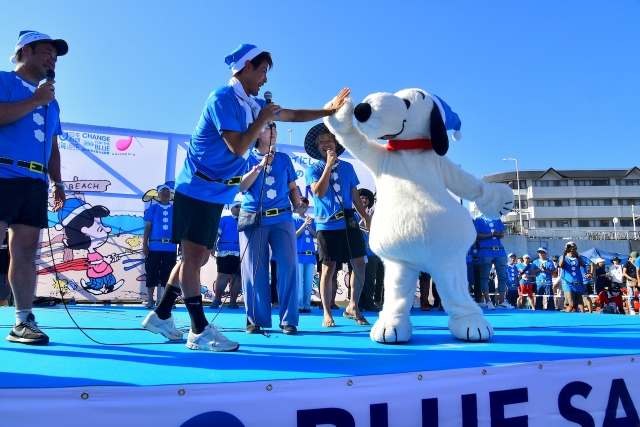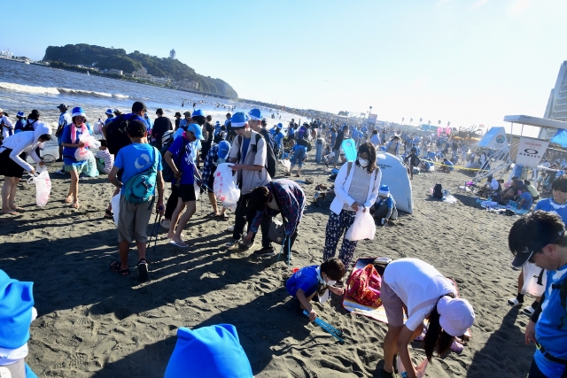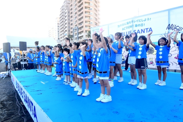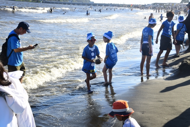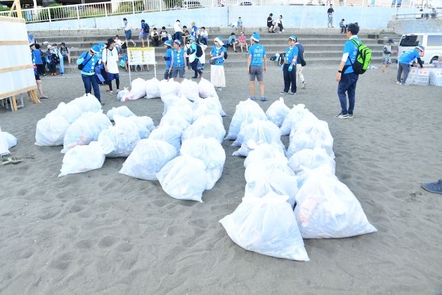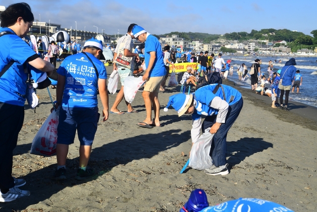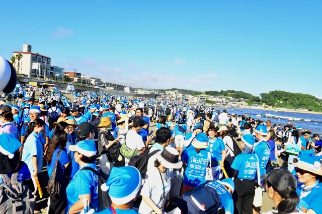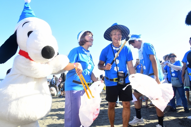 片瀬東浜は青色で染まり、みんな笑顔で海を楽しみながらゴミ拾いをしてくださいました。