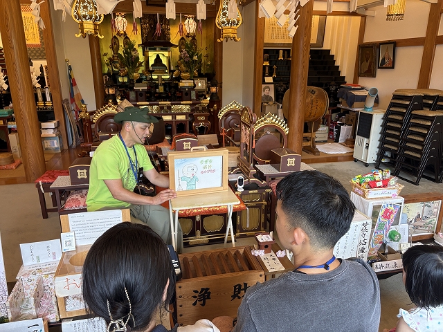 ろっぽんぎ寺子屋チームの活動は、その名の通り妙経寺の小山住職が隊長を務めているため、お寺の本堂で集合です。そして隊長自ら手書きでつくった紙芝居を楽しんでから活動しています。さて、活動はテレ朝通り沿い(旧桜田町)から麻布消防署脇を左折して、旧宮村町のすり鉢を下るコースで活動しました。当日は曇り空で日差しも和らいでいたので、予定通りのコースです。テレ朝通りでは西麻布の大規模再開発を目の当たりにしたり、去年まであった昔の橋の欄干がなくなっていたり、100年も続いていた理髪店が閉店していたり、、、まちの様子が変わりつつありました。そんな様子も含めて将来のおとな達に街の歴史や変遷、愛着などを一緒に感じながらゴミ拾いをすることの大切さを感じました。