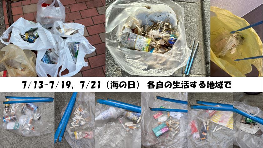 7/13(日)~7/19(土)を主な活動期間として、また、今月は、ブルーサンタ月間でもあったので、7/21(月)海の日も、参加者それぞれの住む地域のゴミ拾いを実施しました。