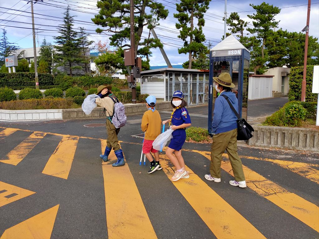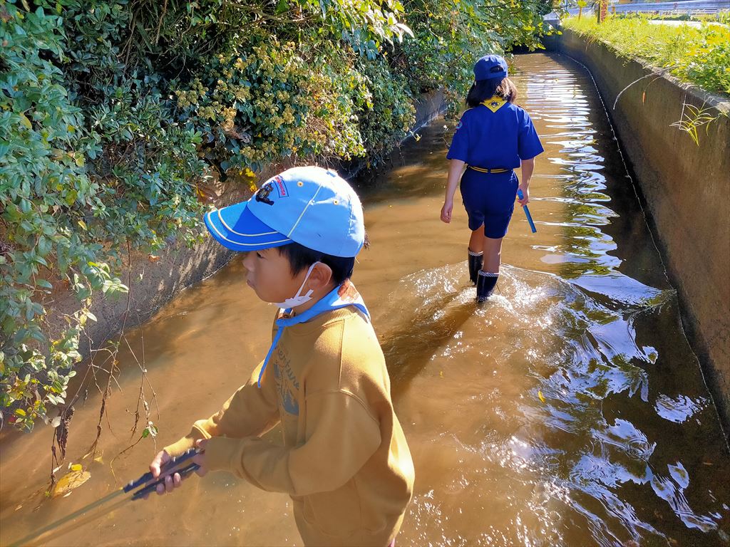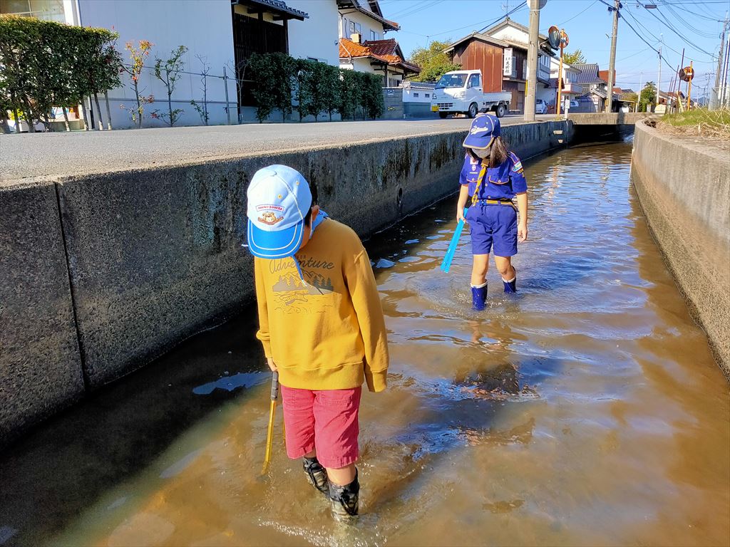 高瀬川清掃にビーバースカウト、カブスカウト、ボーイスカウトそれぞれ一人ずつ+指導者2名参加。