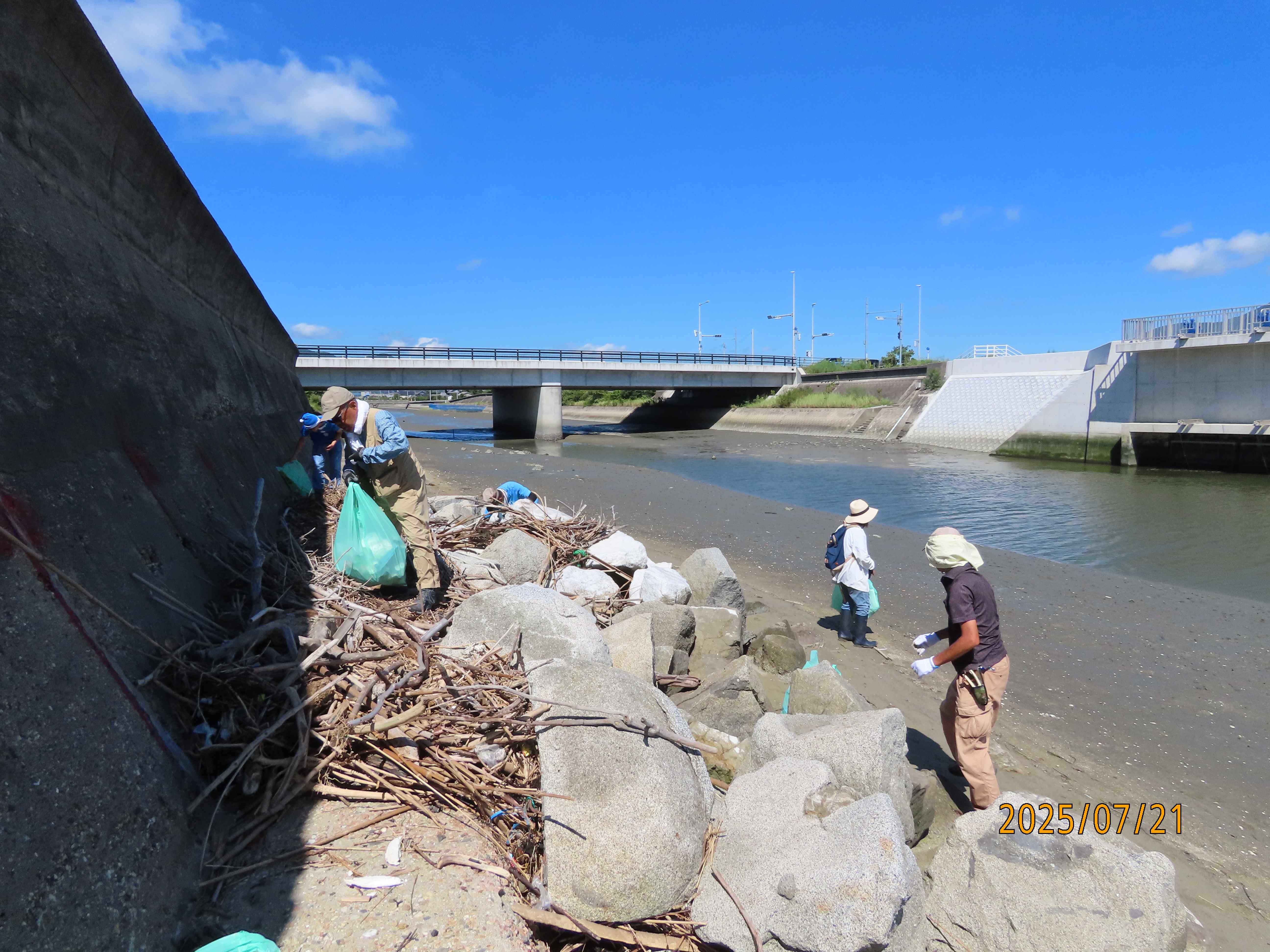 河口部の産卵場所である砂地はごく狭小であるが、産卵が集中する場所で、周辺の捨て石の隙間や波打ち際付近には、流木や竹、ヨシ屑等の自然系の漂着物やペットボトル、プラゴミ等の人工物の海ゴミがたくさん漂着し堆積している。カブトガニが産卵しやすいように、また産卵した砂卵が卵が順調に発生するように、産卵場の整備として漂着ゴミの回収を行った。