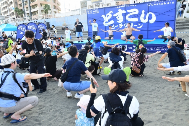 みんなでゴミ拾いをして、相撲体操をして、キレイになったビーチと夕日のなか、