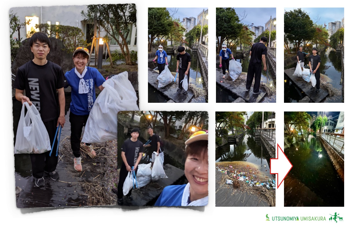 大雨増水のために、釜川の水面に広がったごみを、丁寧に、適切に、暗くなる時間まで、いっしょに拾ってくださいました。