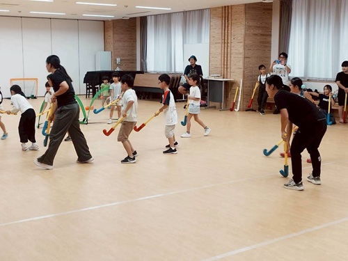 この日は特別に第四日野小学校のお部屋をお借りし、子供たちや地域の方々に向けてホッケー体験を実施しました!