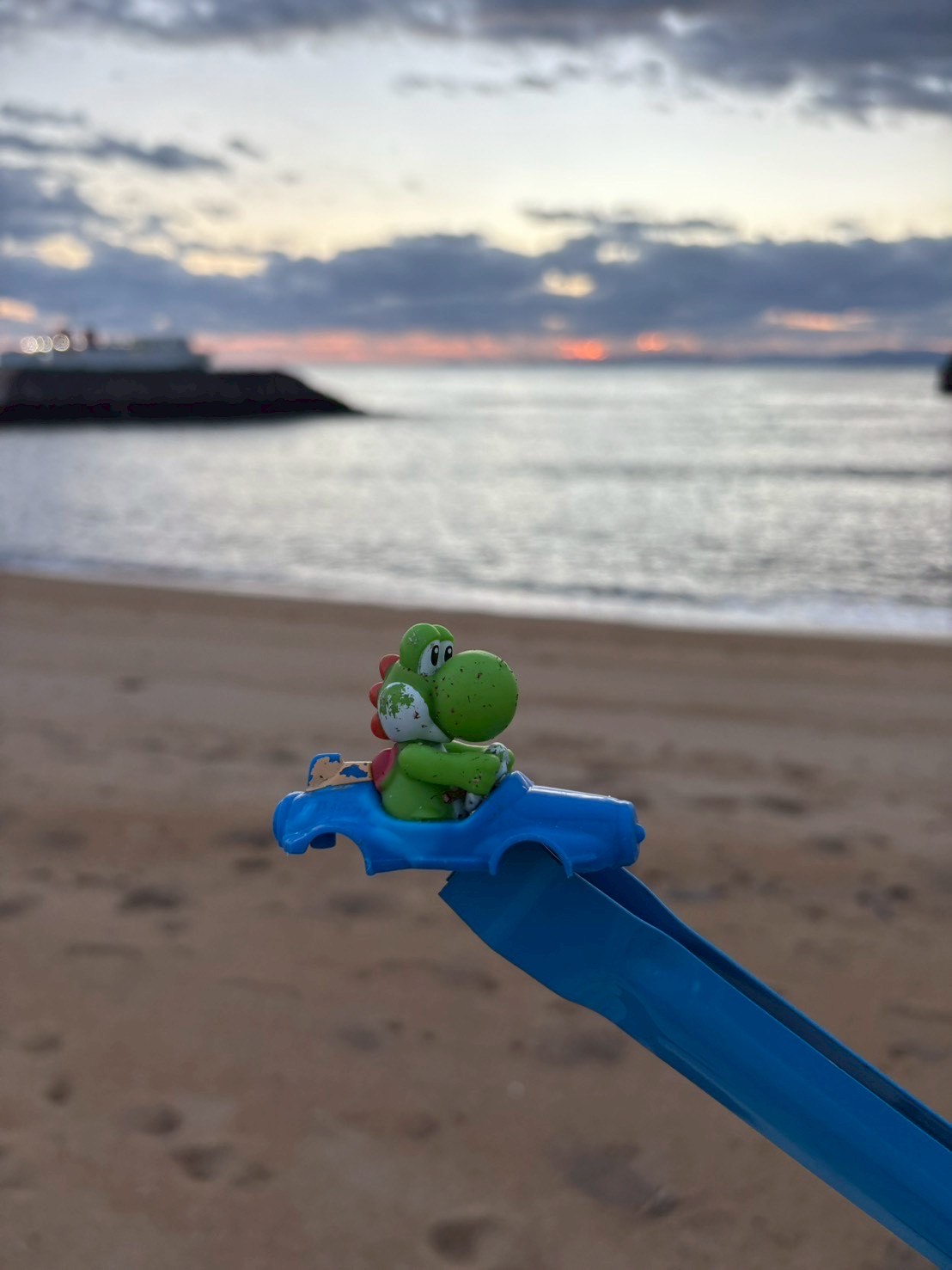 まるで釣り師の活動時間。近くの駐車場に車を停めて、人っ気の無い海岸に向けて歩を進めると、颯爽と現れた一台の原付。おそろくビーチクリーンの仲間…であろう。