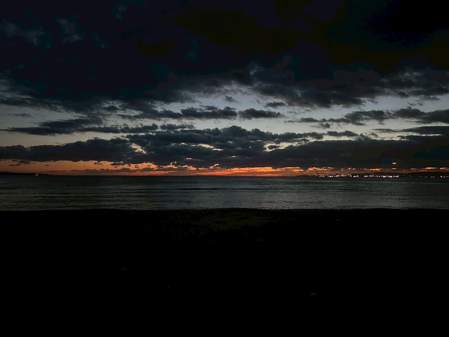 初対面のおっさん二人で、しばし砂浜に立つ。そろそろ動こうかーと思ったところ、一人、また一人と人が集まり、総勢7名に。女子の参入で、暗かった海も、気持ち明るくなってきた気がする…。ただ、みんな寝起きなのか、動きが若干緩慢。