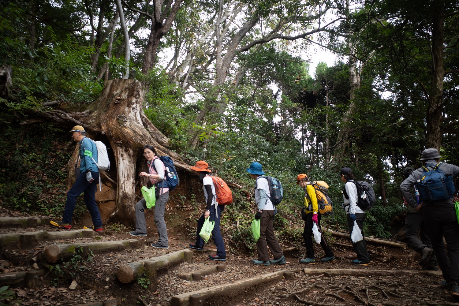 森林インストラクター東京会(略称FIT)が社会貢献活動の一環として実施しているボランティア活動、毎月第一土曜日に月毎に異なる七つのコースで高尾山に登り、自然観察と山頂や登山道のゴミを拾う「高尾山GREEN CLEAN作戦」第172回を参加者29名(FIT会員6名、一般参加15名、スタッフ8名)、カツラ林コースで実施しました。