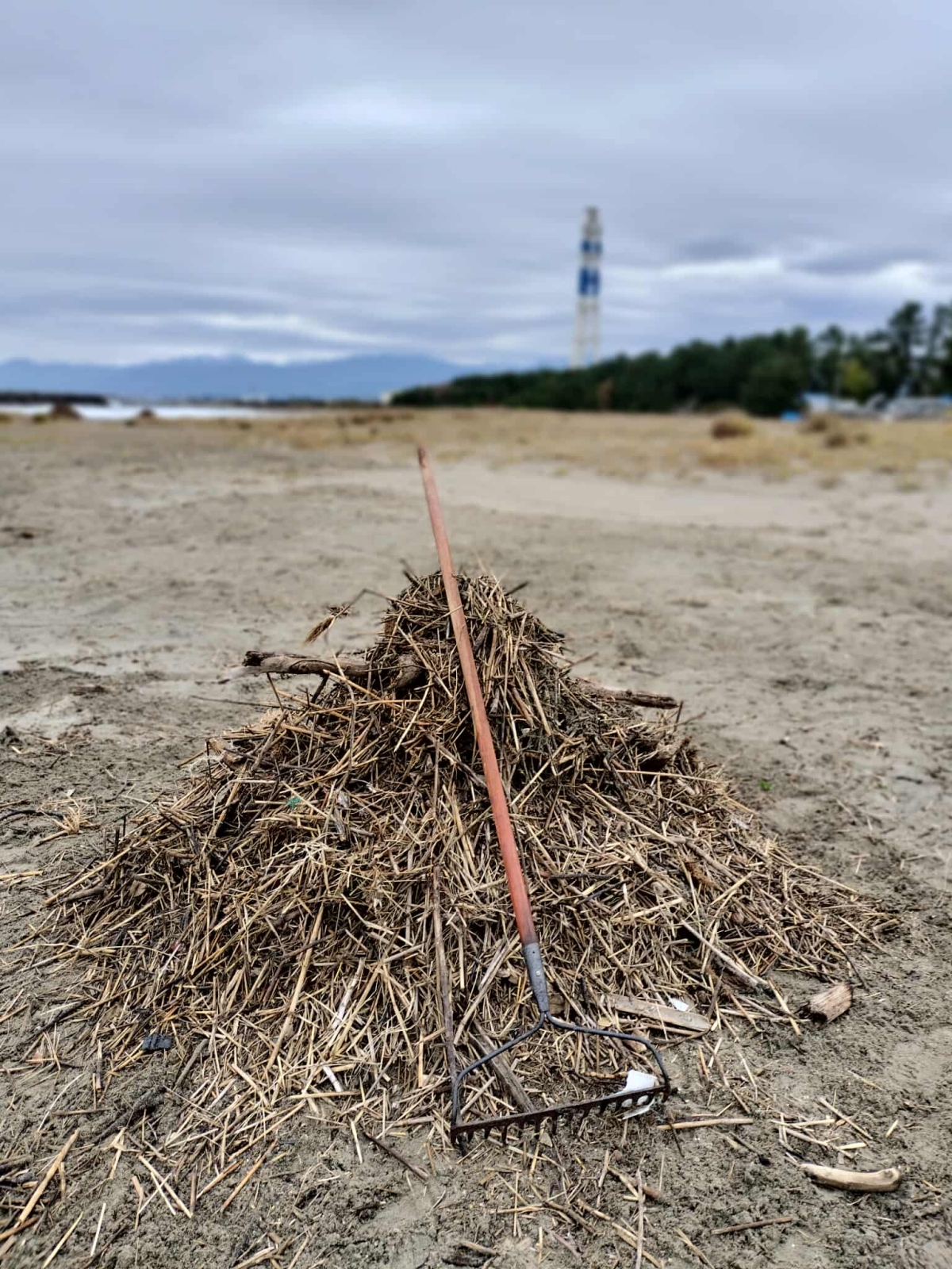 今日はレーキを使いながら、流れ着いた漂着物を集めていただきました。