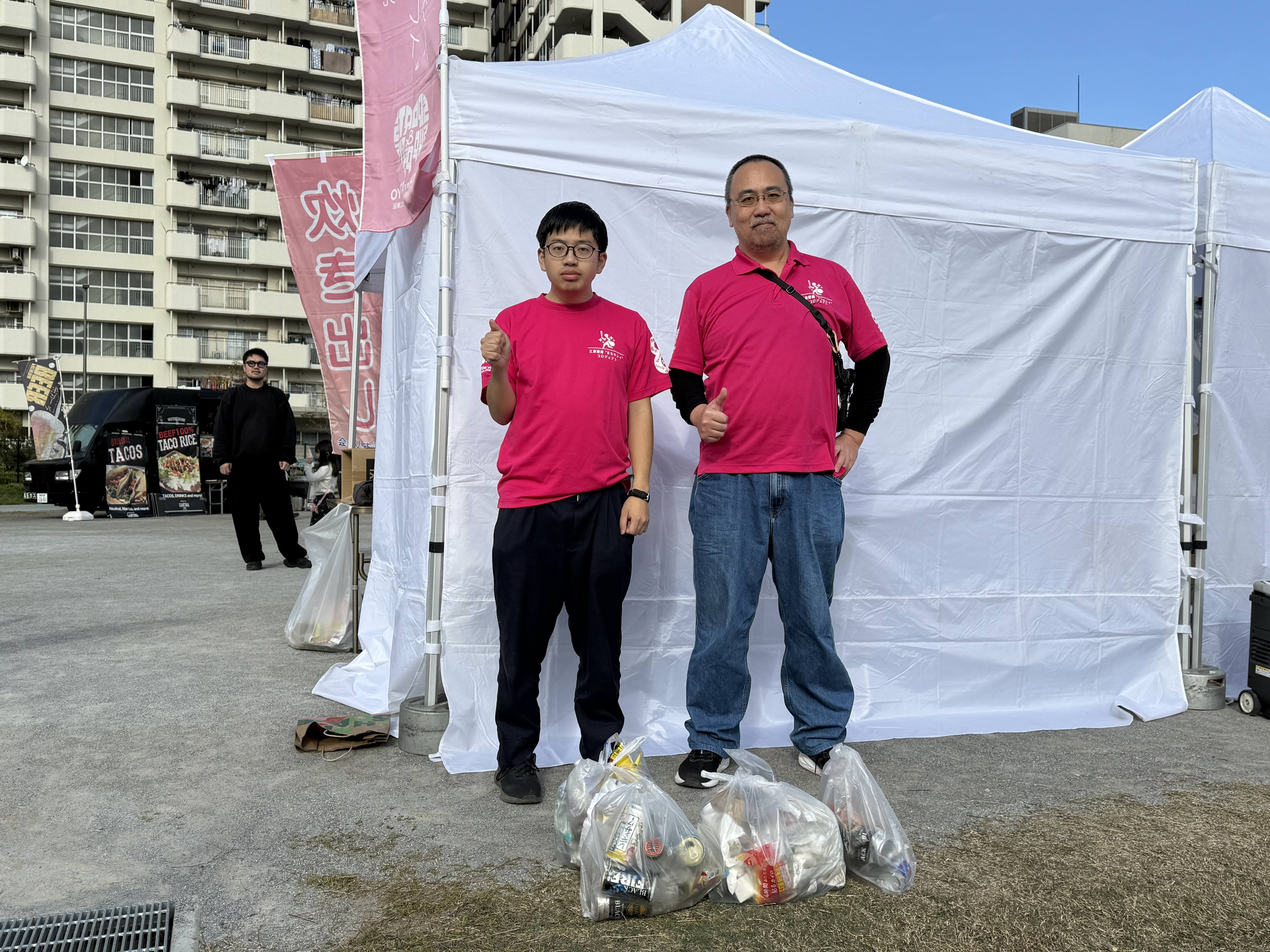 運営のお手伝いの合間には、会場周辺のごみ拾い活動も実施しました。参加した2名で歩きながら、ペットボトル・空き缶・包装ごみなどを回収し、予想以上に多くのごみを集めることができました。少人数ではありましたが、地域の環境美化に貢献できたと感じています。
