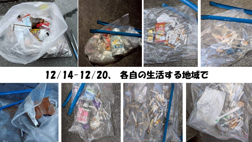 12/14(日)~12/20(土)を活動期間として、参加者それぞれの住む地域のゴミ拾いを実施しました。