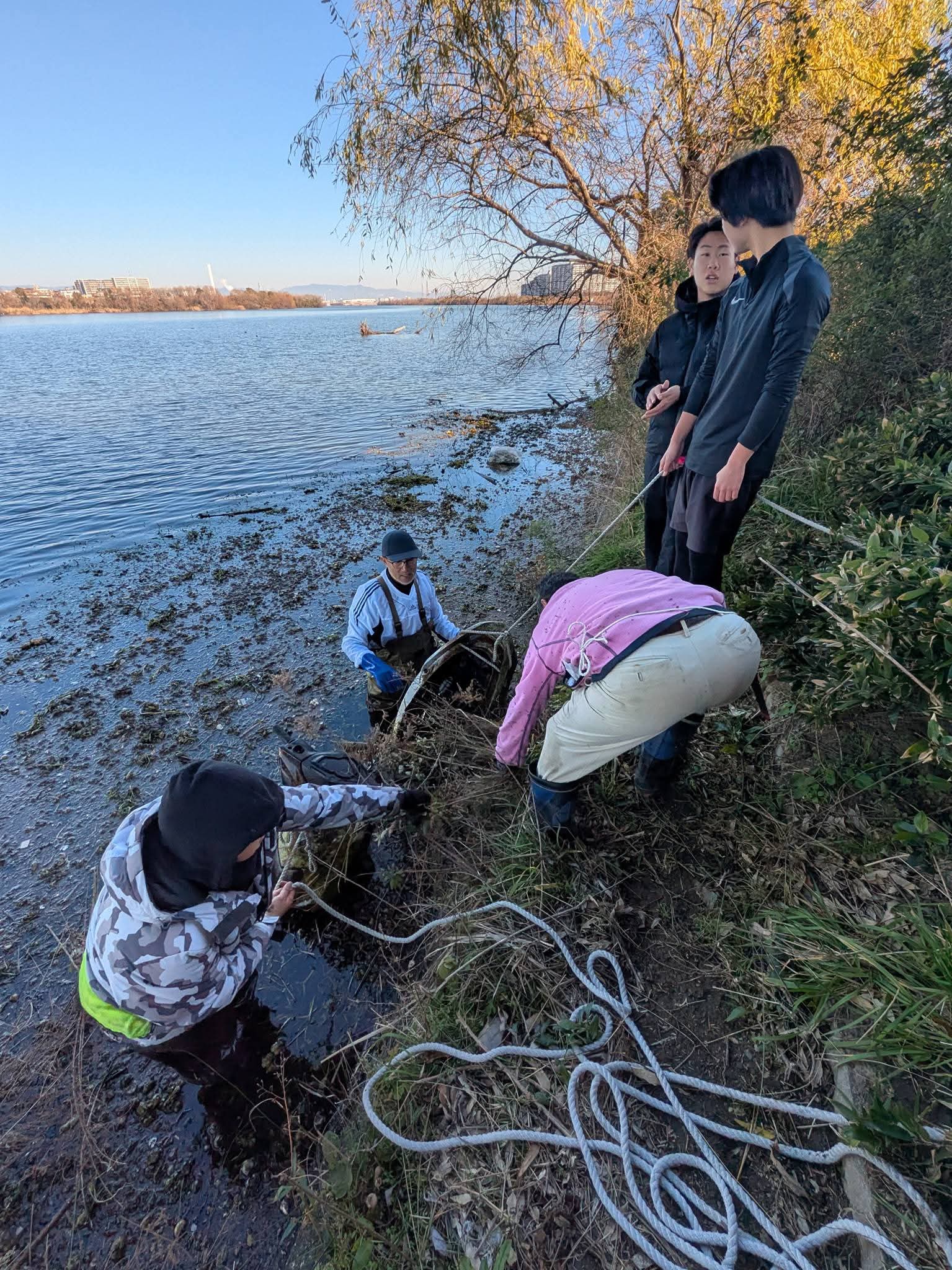 見かねた道場さんが、公園でサッカーをしていた2人の中学生と、ジョギングをしていた男性に手伝ってほしいと声をかけてくれたので、彼ら助っ人の力も借りながら、なんとか引き上げることができました。