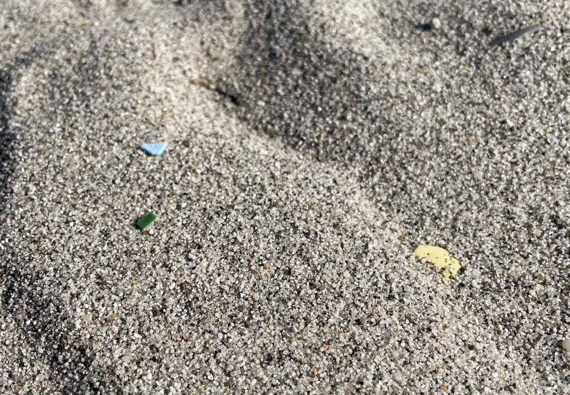 一見きれいに見える砂浜でも、砂をふるうと細かなプラスチック片が次々と現れ、