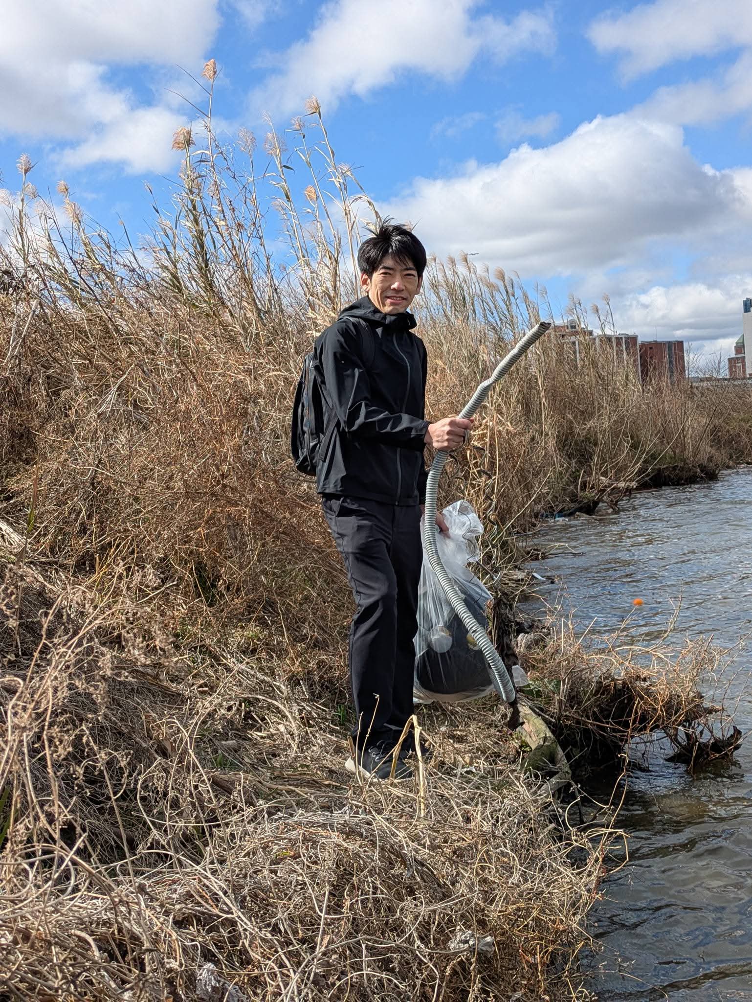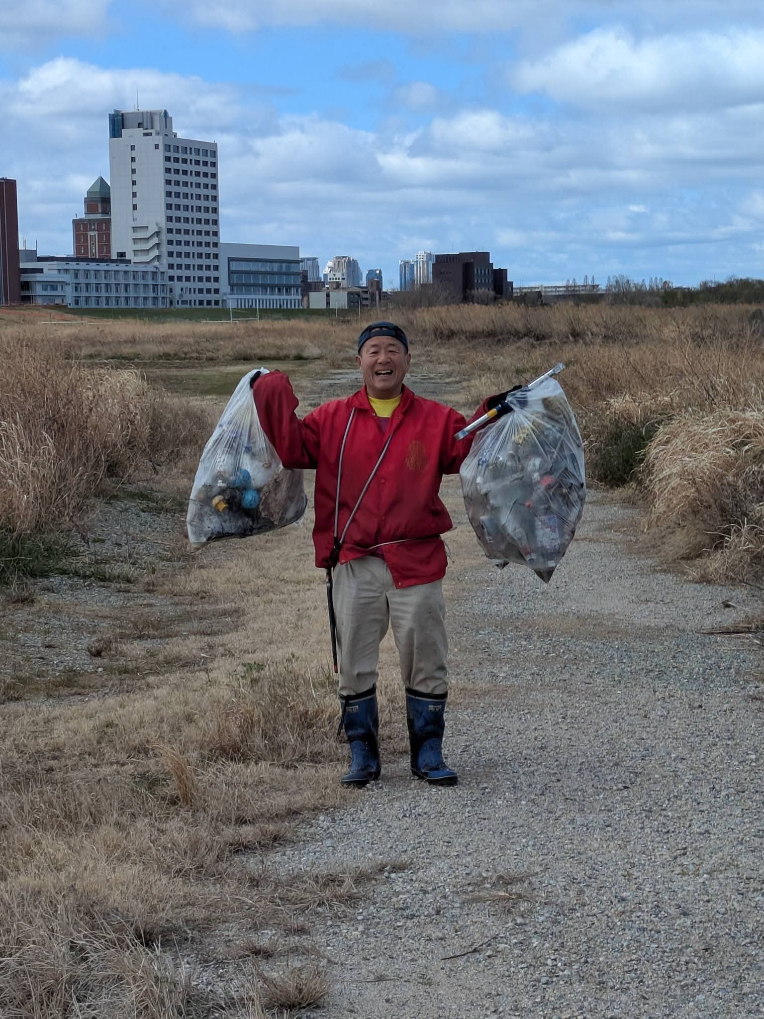 風が強いと川岸に押し寄せる波が高くなり、赤い長靴の上から水が浸入しビショビショになったんですね。