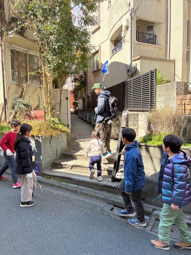 集合場所のお寺を出発し、麻布十番方面へ。「ゴミ拾いビンゴ」を行い、さまざまな種類のゴミを見つけながらビンゴを埋めていきました!「あと1つでビンゴだ」「おーい、見つけたよ!」とビンゴの数に応じてお菓子を渡すことで、おもいっきり楽しみながらも、自然と環境やゴミへの意識を高める取り組みとなりました!