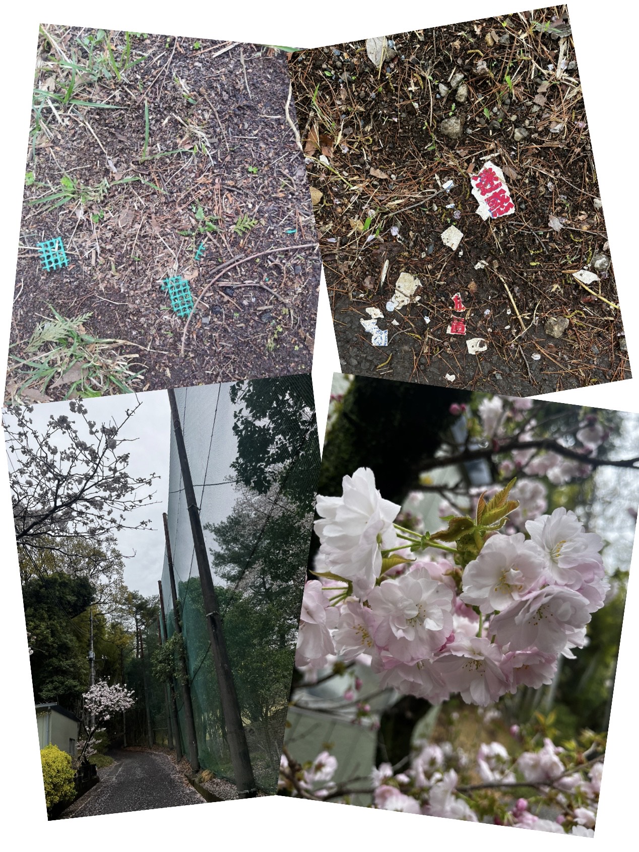 西武園ゴルフ場の脇は地滑り防止ネットでしょうか、バラバラ破片になった緑のプラスチックが多数落ちていました。こちらは小学生に行う校外学習の資料にお使いになるとのこと、集めて持ち帰られました。海のゴミ、山のゴミ、どういった場所にどういったゴミがあるのか、こどもたちも勉強する良い機会になるでしょうね。