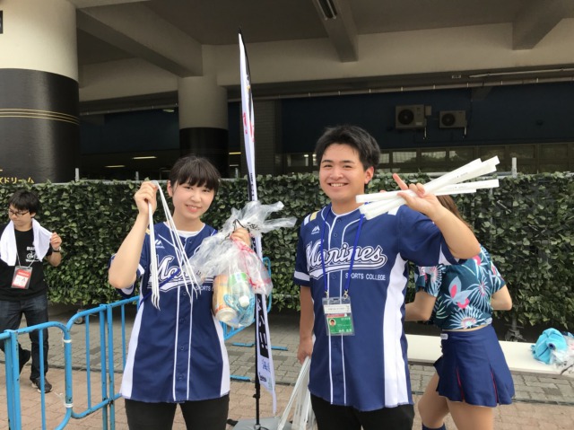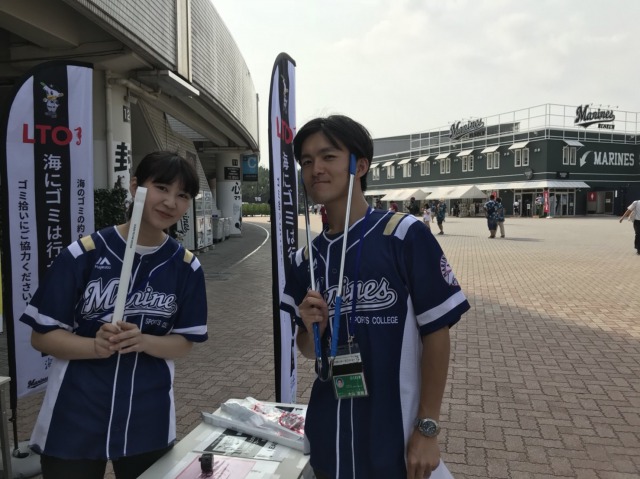 千葉ロッテマリーンズ対東北楽天ゴールデンイーグルスの11回戦が行われました。 この日の試合は、1ヶ月半ぶりに二木投手が先発。7回2失点の好投をみせるも、後続の投手 が打ち込まれ、6-2で敗戦。悔しい4連敗となってしまいした。その試合前に、第10回 「LEADS TO THE OCEAN~海につづくプロジェクト」を実施しました!気持ちの良い天 気の中行われた10回目は、25名の方と一緒にゴミ拾いを行いました。