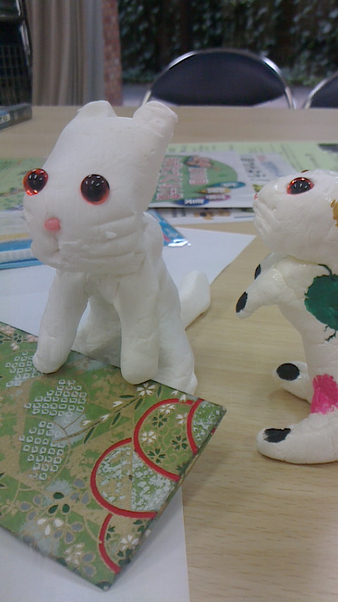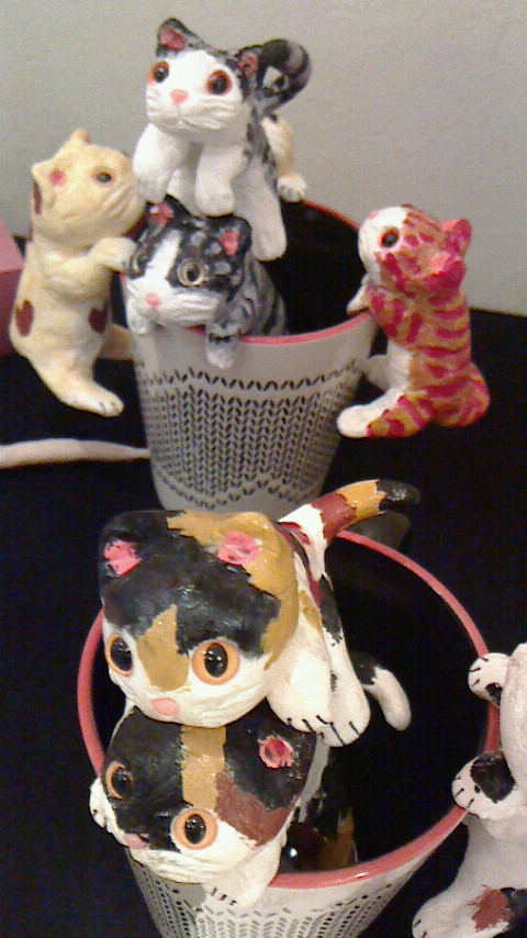 私の作品展は、初めは普通に絵画展でしたが、コミュニティカフェの方々が手に取りやすい、小物やポストカードなども増えてきました。特に今年、人気だったのは軽量ねんどで作った子猫たちでした。他のねんどと違い、軽量ねんどは軽くて丈夫なので、子供さんが手に取って遊び、床に落としても大丈夫