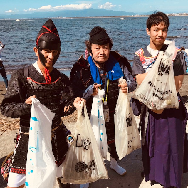 久しぶりに、深沢砦から鎧で出陣。海さくらのゴミ拾い隊長が不在で、もののふ隊の石さんの掛け声で、ビーチクリーンスタート。