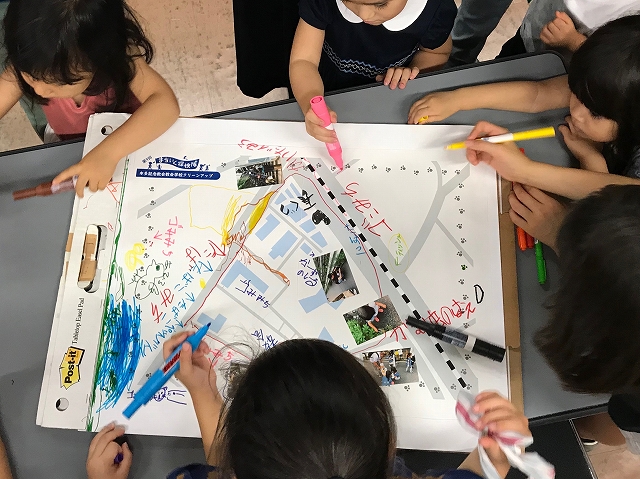 最後に恒例のマップづくりをしました。今回はいつもより年少のお子さんが積極的にマップを作ってくれて「アート」なマップになりました。正しいとか綺麗とかではなく、自分たちが主体性をもって作る!そこは街いく探検隊が大切にしたいことだと思っています。